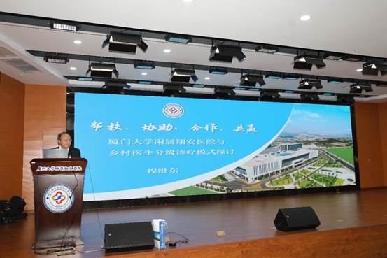 程继东教授作了题为《帮扶,协助,合作,共赢——厦大附属翔安医院与乡村医生分级诊疗模式探讨》的主题报告。介绍了厦大翔安医院相关情况;回顾了厦大翔安医院如何携手乡村医生,把优质医疗资源下层到基层;并表示医院将继续完善相关措施,通过为乡村医生免费体检,开展临床诊疗示范、学术讲座等活动服务于乡村医生,为提高乡村医疗水平和保障基层群众的身体健康做出大型三级医院应有的贡献。