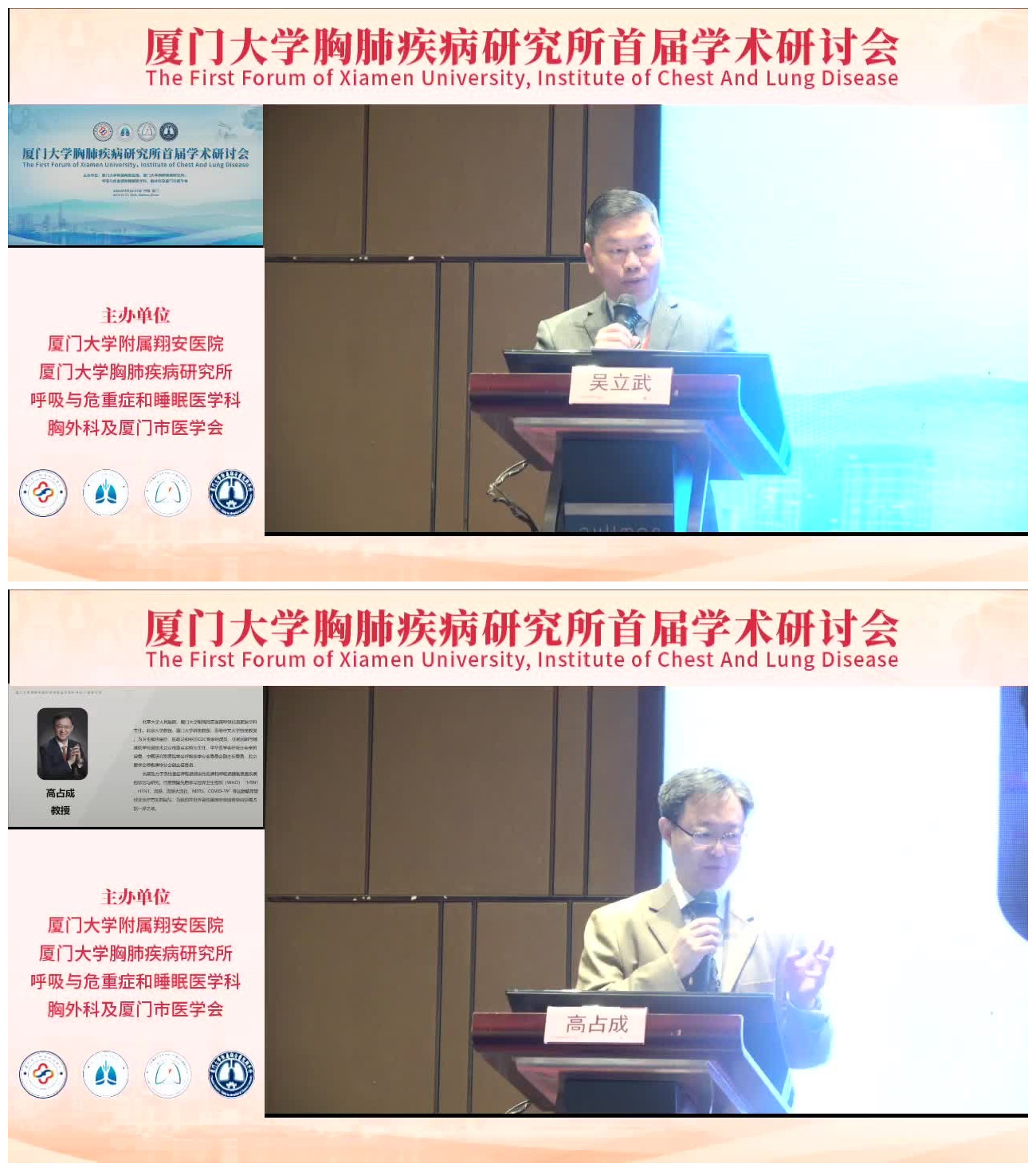 本次学术研讨会由厦门大学附属翔安医院、厦门大学胸肺疾病研究所呼吸与危重症和睡眠医学科、胸外科及厦门市医学会主办。厦门大学附属翔安医院党委书记吴立武同志及厦门大学胸肺疾病研究所所长高占成教授先后发表致辞,他们肯定了厦门大学胸肺疾病研究所成立的重要意义,并对本次学术研讨会给予殷切期望。