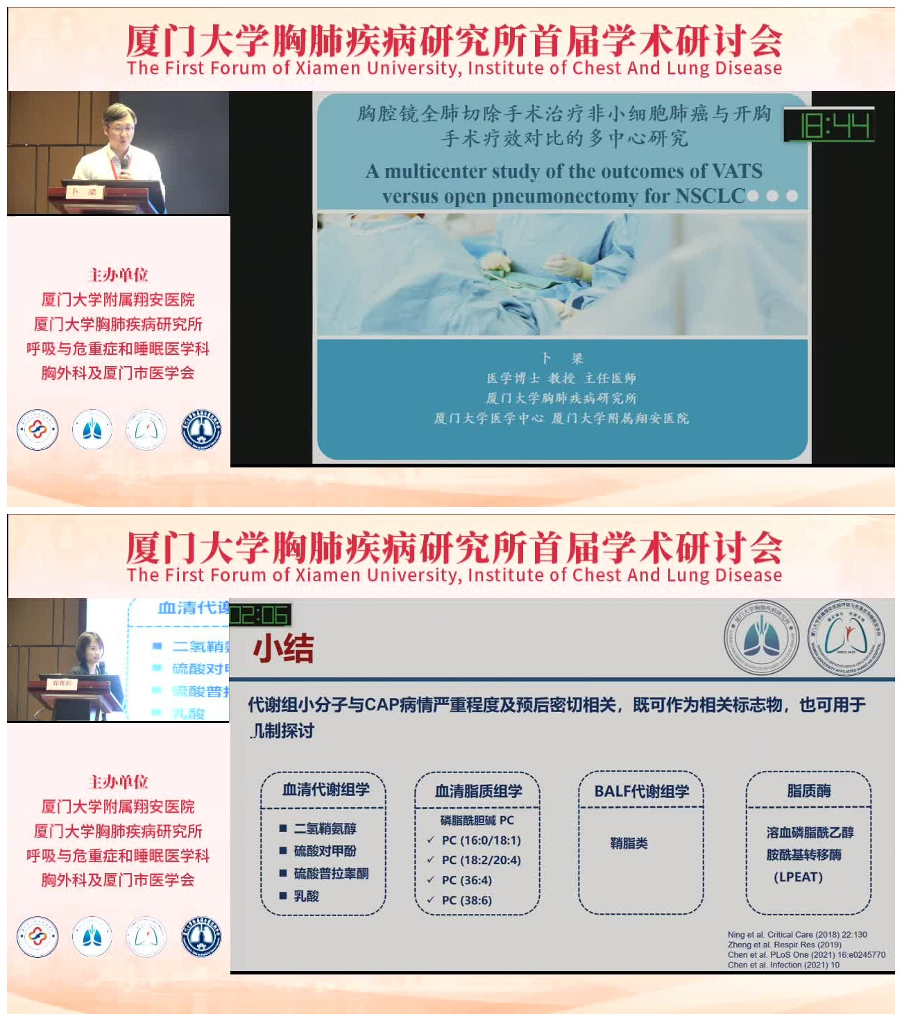 卜梁教授介绍了“胸腔镜全肺切除手术治疗非小细胞肺癌与开胸手术疗效对比的多中心研究”,并分享了精彩的手术视频,而郑雅莉助理教授则从血清代谢组学、肺泡灌洗液代谢组学、脂质酶检测三个方面阐述了代谢组学在肺炎病情预警和评估中的应用。