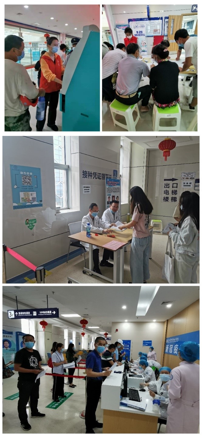 此次接种过程中,在充分考虑疫情防控的情况下,医院科学组织,通过分区分流的方式对受种人员进行分流,分批进入等待区,在保障接种工作有序开展的同时,有效防止了人员聚集拥堵情况。与此同时,门诊部进一步加强服务能力,在受种者等候区、签字区设置大量座椅,提高了患者的就诊满意度;在接种观察区设了饮水机,提供一次性纸杯,体现了人性化服务;在受种者等候区的走廊两侧墙面张贴了多种印有医院公众号及接种流程图的宣传海报,让更多患者了解医院,扩大了医院知名度;志愿者及服务保障人员热心为受种者进行指引、问题解答及现场宣教,展现了良好精神风貌和服务意识。
