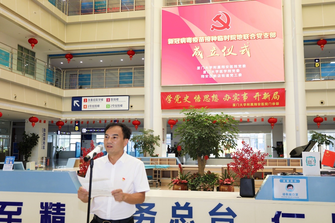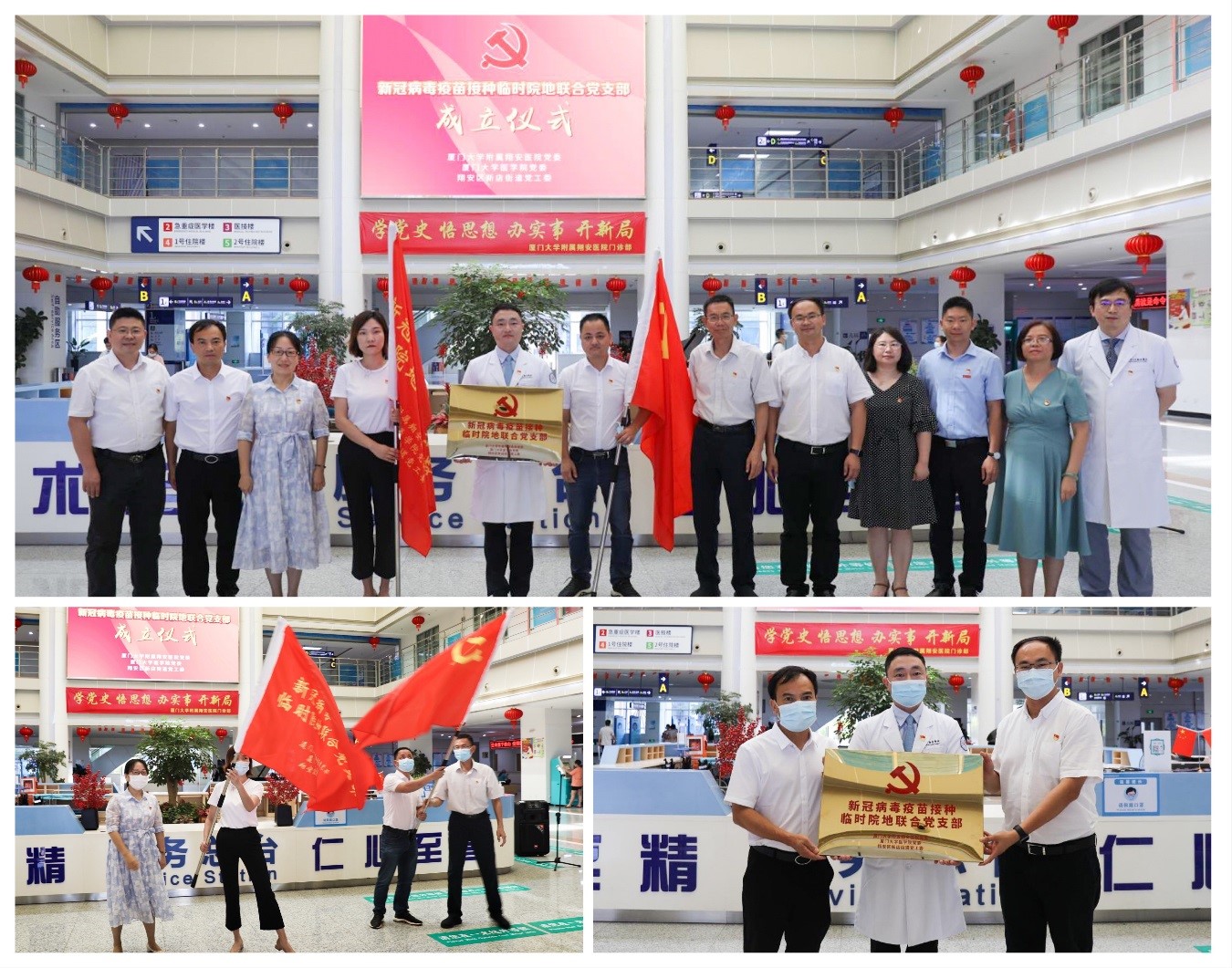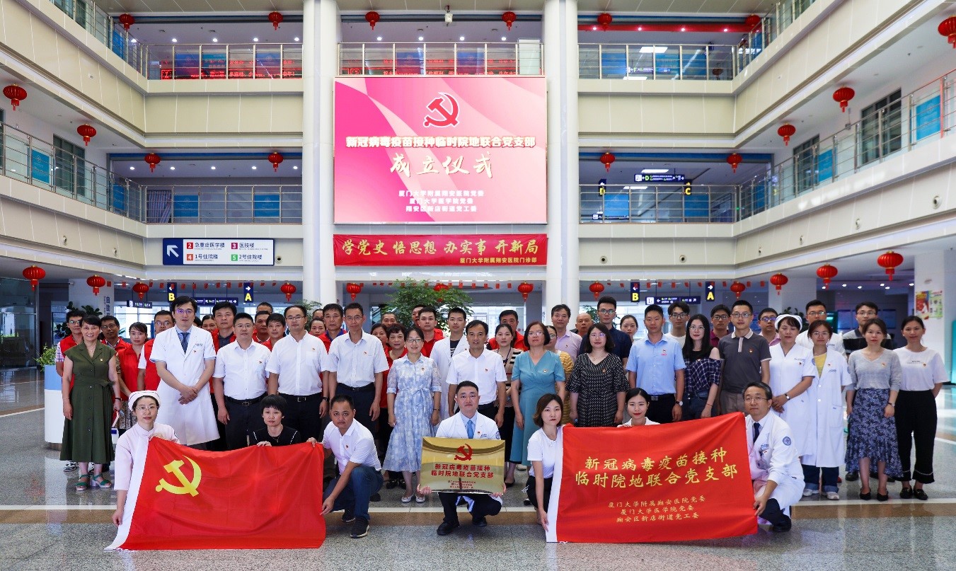 5月27日下午,厦门大学附属翔安医院、厦门大学医学院以及厦门市翔安区新店街道在我院门诊大楼一楼举行了新冠病毒疫苗接种临时院地联合党支部成立仪式。这个全新的联合党支部由院地三方共同成立,为厦门市首个新冠病毒疫苗接种临时院地联合党支部,目前共有党员41人,由参加疫苗接种工作的我院医护人员及职能部门党员、厦大医学院教职工党员代表以及新店街道党员代表组成。