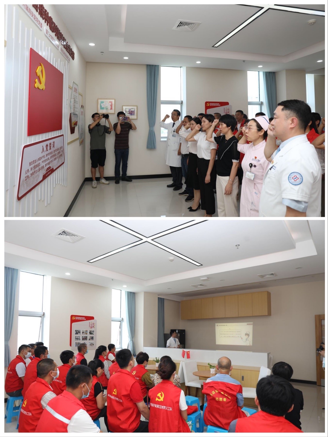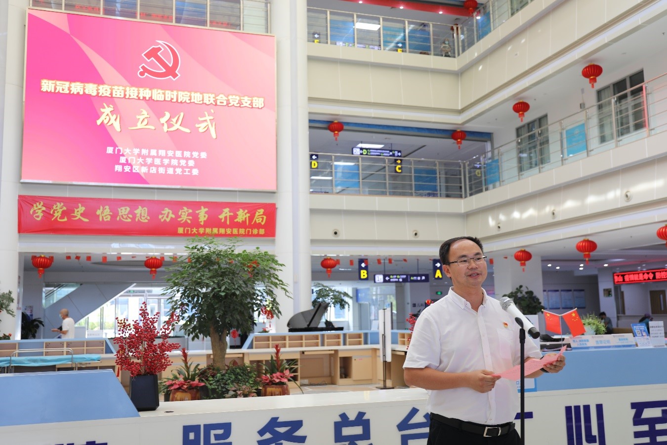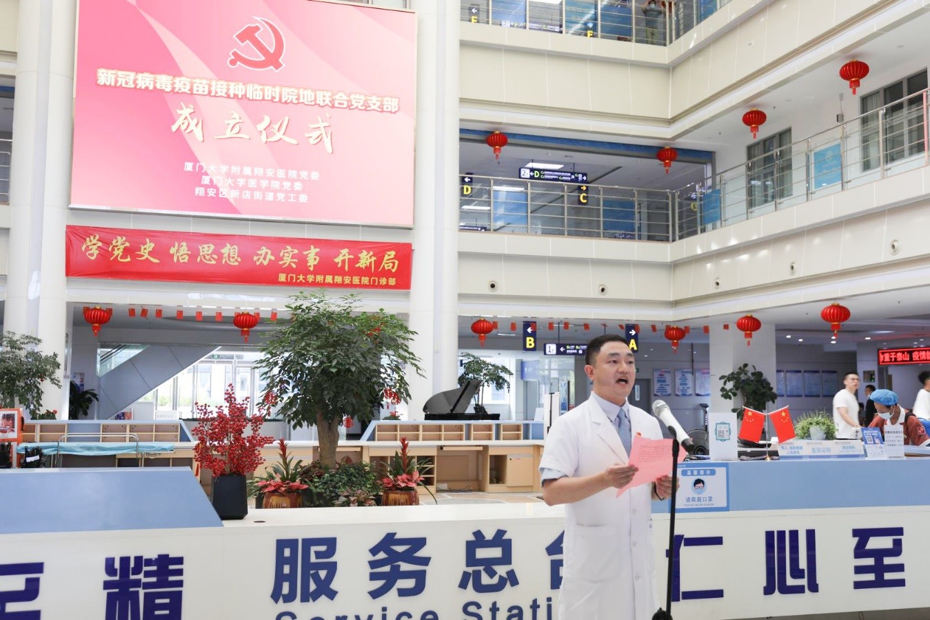 5月27日下午,厦门大学附属翔安医院、厦门大学医学院以及厦门市翔安区新店街道在我院门诊大楼一楼举行了新冠病毒疫苗接种临时院地联合党支部成立仪式。这个全新的联合党支部由院地三方共同成立,为厦门市首个新冠病毒疫苗接种临时院地联合党支部,目前共有党员41人,由参加疫苗接种工作的我院医护人员及职能部门党员、厦大医学院教职工党员代表以及新店街道党员代表组成。