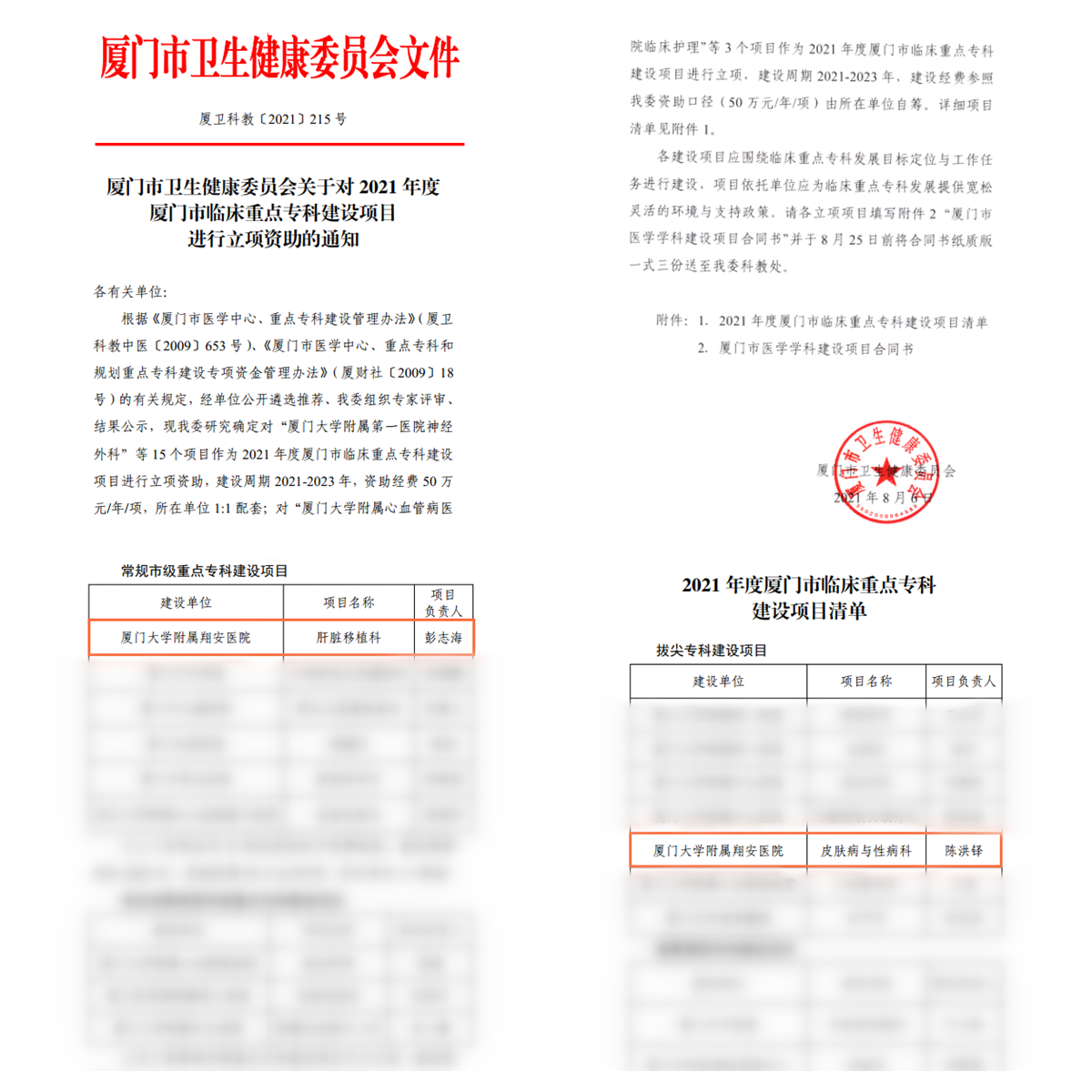 经自主申报、专家评审、结果公示,厦门市卫生健康委员会近日确定厦门市卫健系统6个临床学科为2021年度厦门市临床重点专科建设常规项目,厦门大学附属翔安医院由彭志海教授领衔的肝脏移植科荣列建设名单。同时,为加强与厦门大学医学领域医教研系统的合作,市卫健委此次还将厦门大学医学院业已成立的7个临床学系的挂靠科室列入拔尖专科建设项目,其中包括我院由陈洪铎院士挂帅的皮肤病与性病科。这是我院自2019年开业来,继入选市重点实验室和市临床医学研究中心建设单位之后,再一次在厦门市主要重点专业平台领域获得佳绩和认可。