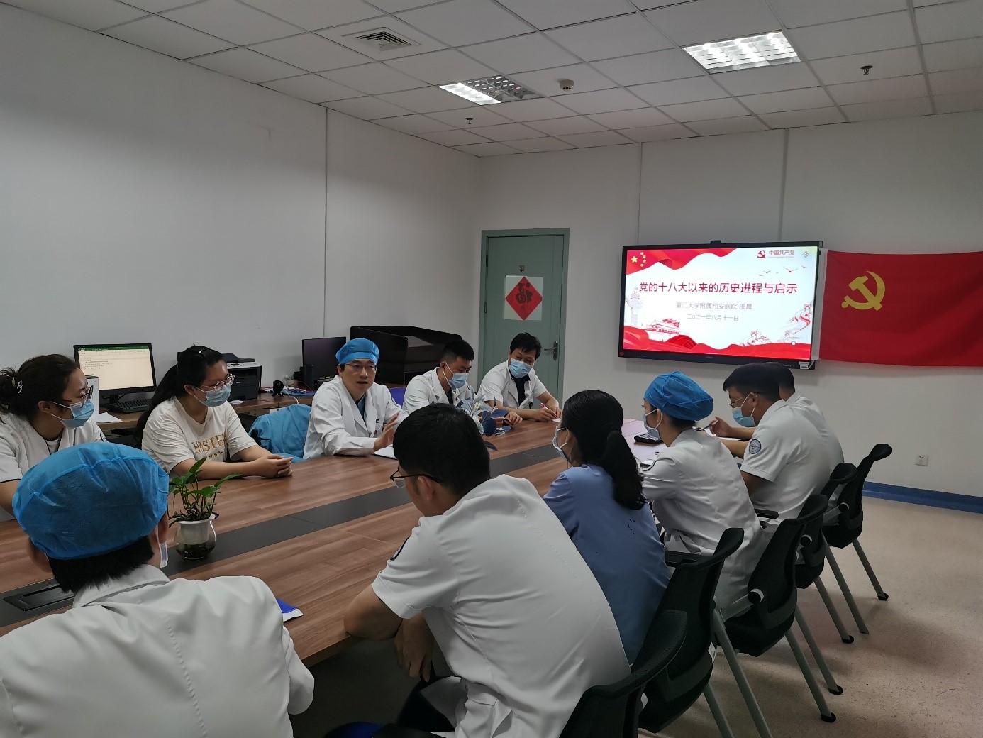 8月11日,副院长邵晨以《党的十八大以来的历史进程与启示》为主题,为急诊重症党支部全体党员上党课。按照党的光辉历程党史大事件时间轴逻辑分明为党员介绍党的十八大以来的历史进程。通过党课学习,支部党员同志们对于中国特色社会主义进入新时代有了更深层的理解,对砥砺迎难而上的奋斗精神也有了更直观的体会。