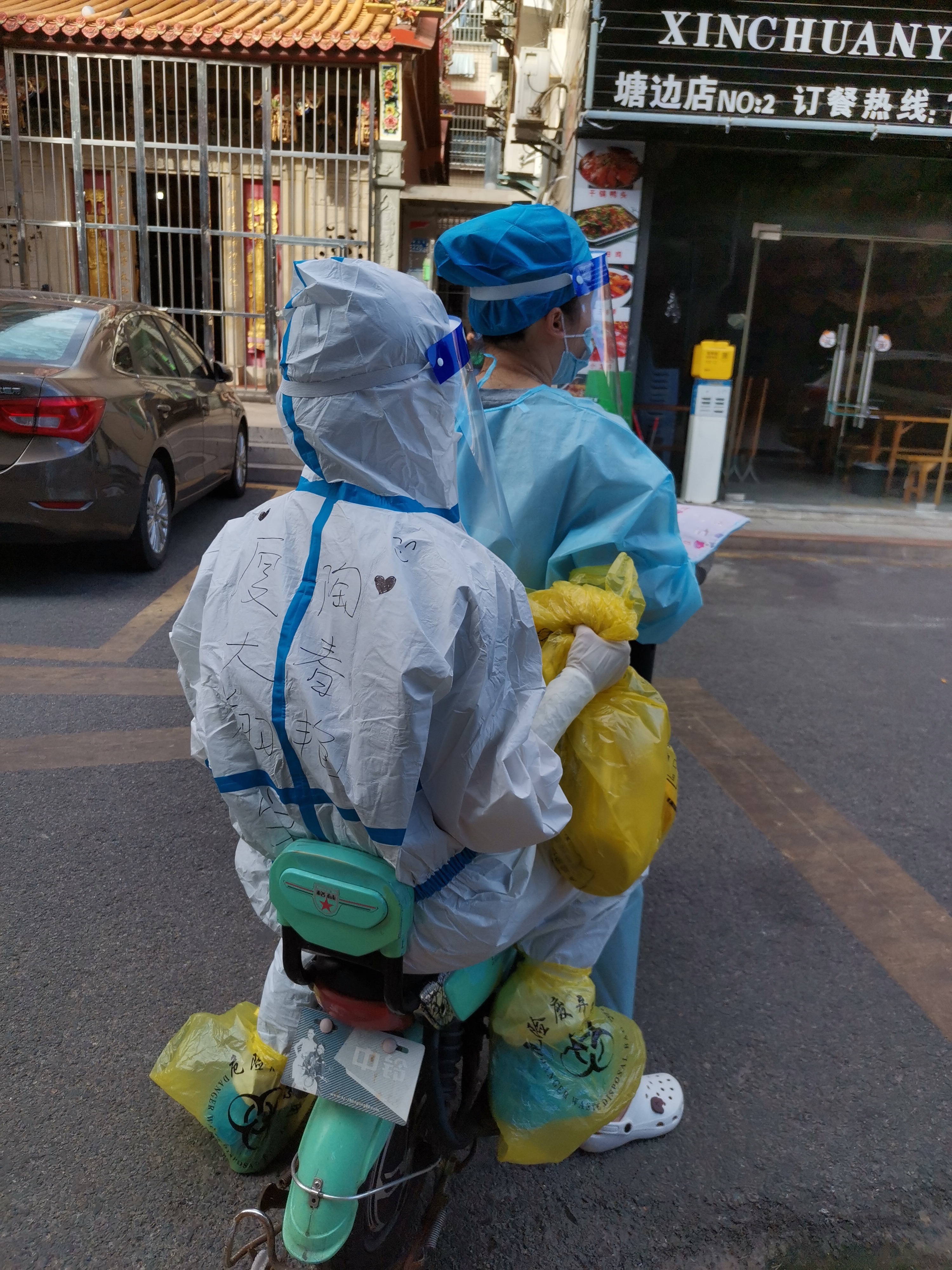 ▲我院核酸应急队队员坐电动车去居民家给行动不便卧床的老人采核酸