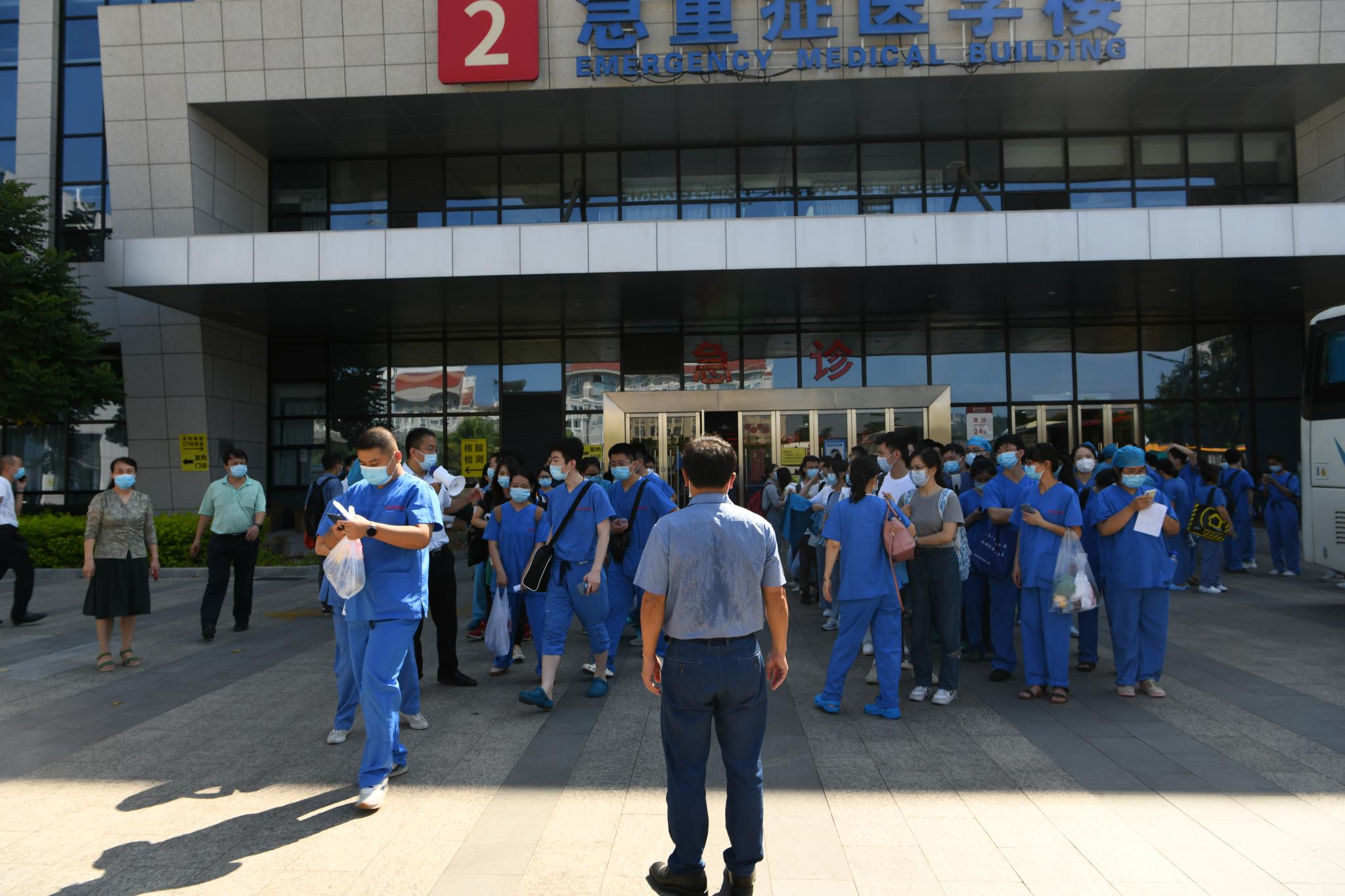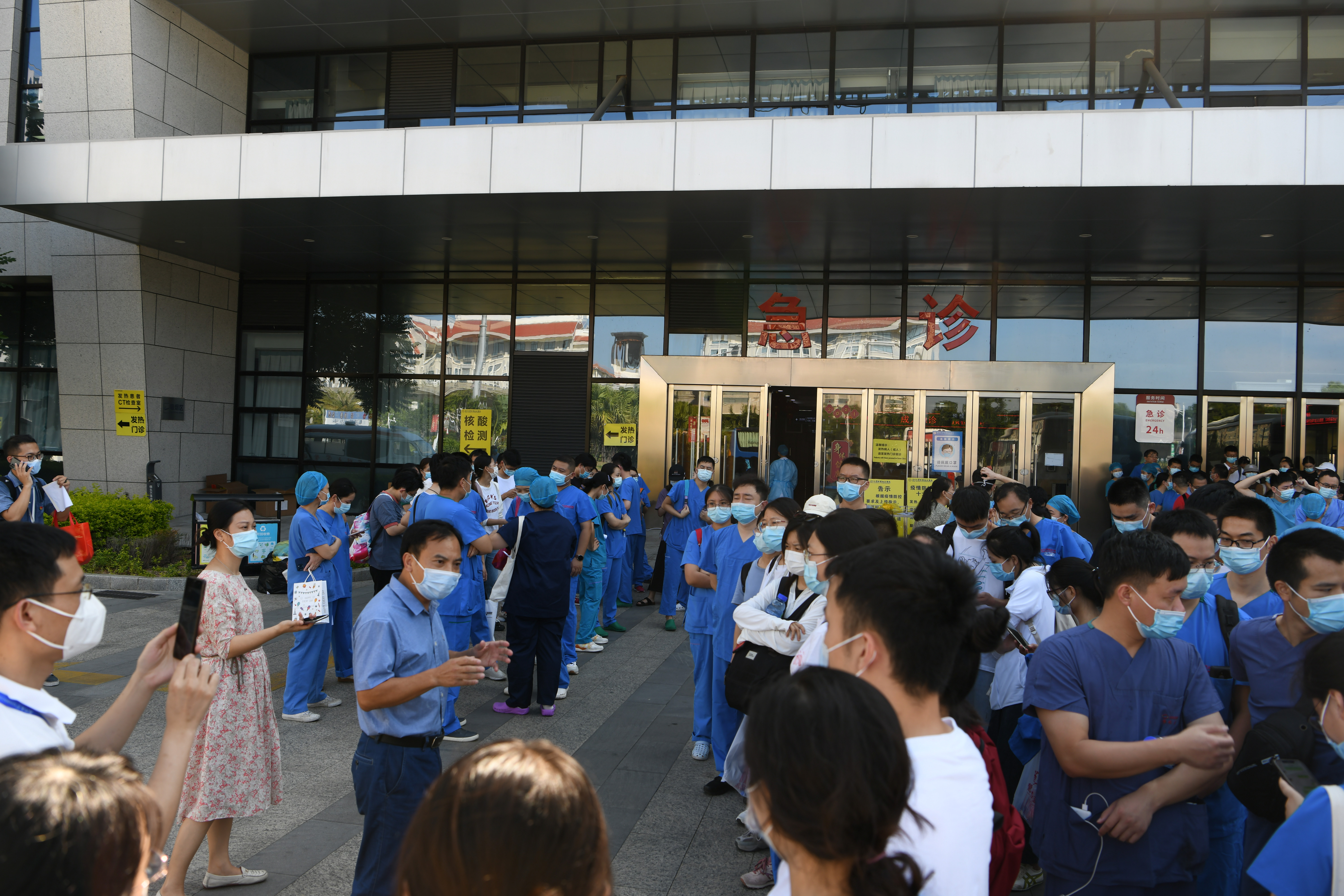 今日清晨6点半,我院已派出60名医护人员增援核酸采样,8点半左右又接到上级紧急通知,要求我院再火速增派150名医护人员。很多医护人员昨天刚从支援阵线下来,接到通知时并不在院,但是听到召唤后不仅毫无怨言,还连声说:“我可以过去,现在立刻就出发,不过对不起住得有点儿远,可能要稍微晚一点点到。”9点40分,我院148名医护人员集结完毕,出发前往各个核酸采样点。
