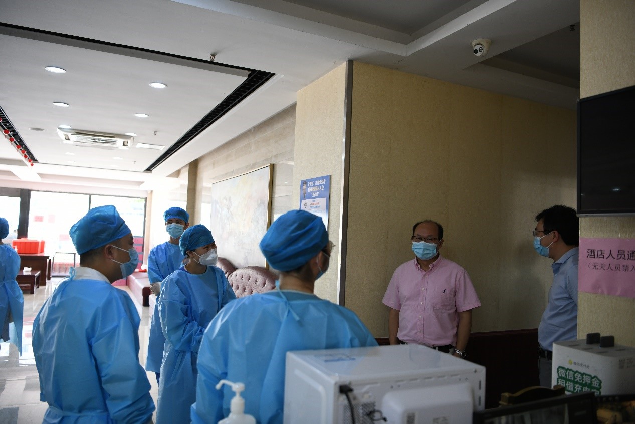 执行院长张国君关心了解驻地酒店的院感防控和医护人员生活保障情况,要求进一步严格院感防控措施,改善生活配套条件,在政府部门的指导和支持下,及时满足一线人员的生活和防护需要。