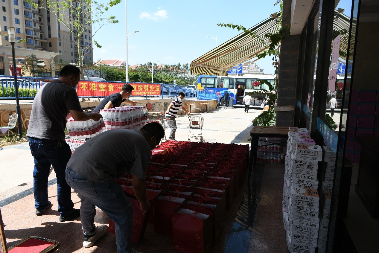 ▲院工会和后勤保障部工作人员搬运牛奶、食品和矿泉水