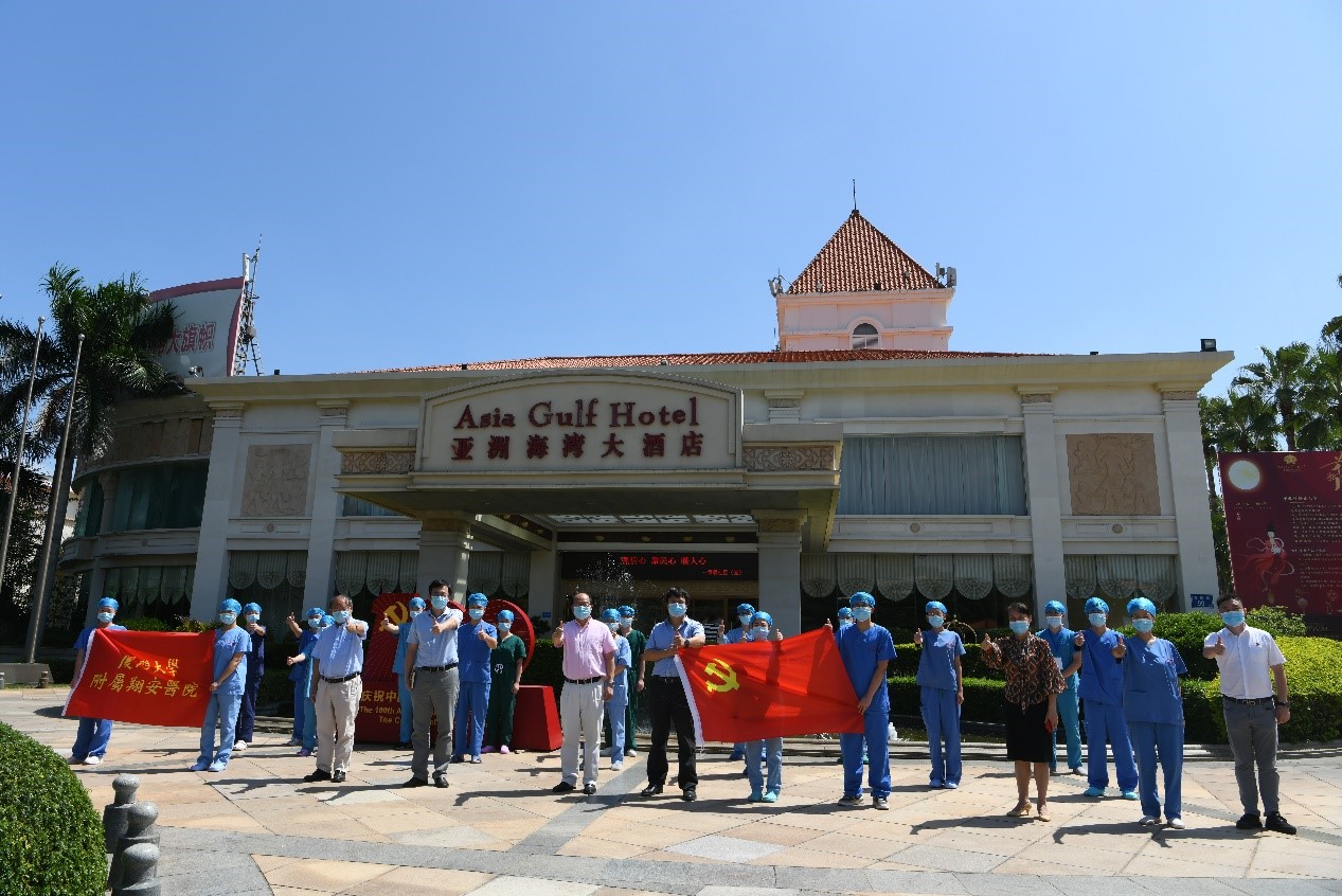 10月5日上午,我院执行院长张国君、副院长邵晨、副院长程继东一行先后到凌波湾酒店、亚洲海湾大酒店,看望慰问在隔离病房及康复病区一线工作的222名医护人员,为他们送上慰问品。院长助理刘风、工会副主席邓斌、院办负责人陈甜、后勤保障部负责人陈翎等参加慰问。
