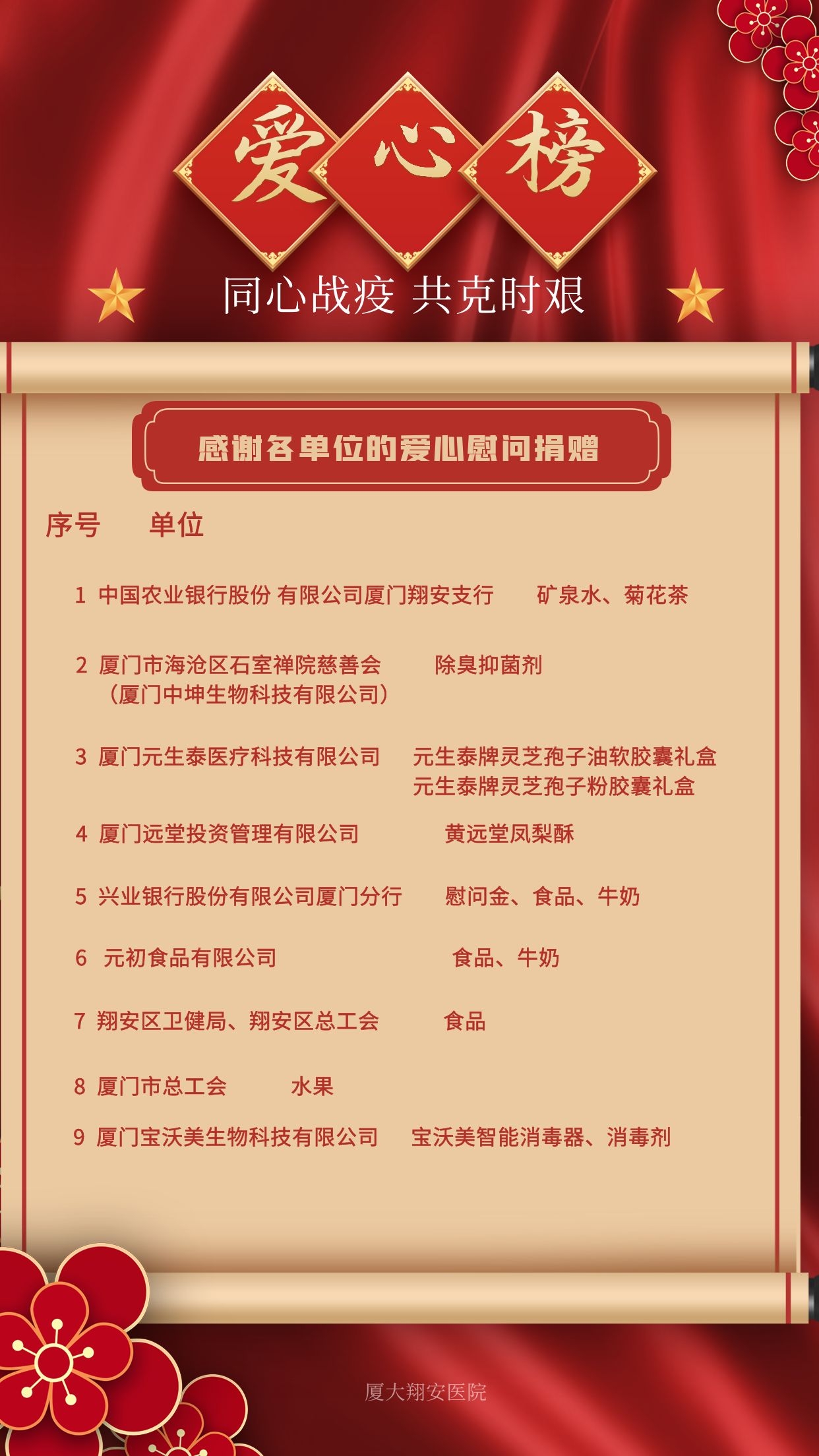 感谢勇担社会责任、援手支援的爱心企业:厦门元生泰医疗科技有限公司捐赠灵芝孢子油软胶囊及灵芝孢子粉胶囊;厦门远堂投资管理有限公司捐赠黄远堂凤梨酥等食品;中国农业银行股份有限公司厦门翔安支行捐赠菊花茶、矿泉水等清凉饮品;兴业银行股份有限公司厦门分行和元初食品有限公司捐赠的慰问金、牛奶、食品等;感谢各企业燃起爱心之火,为一线医护人员提供了有力的物质与精神的支持,给了我们温暖和动力。