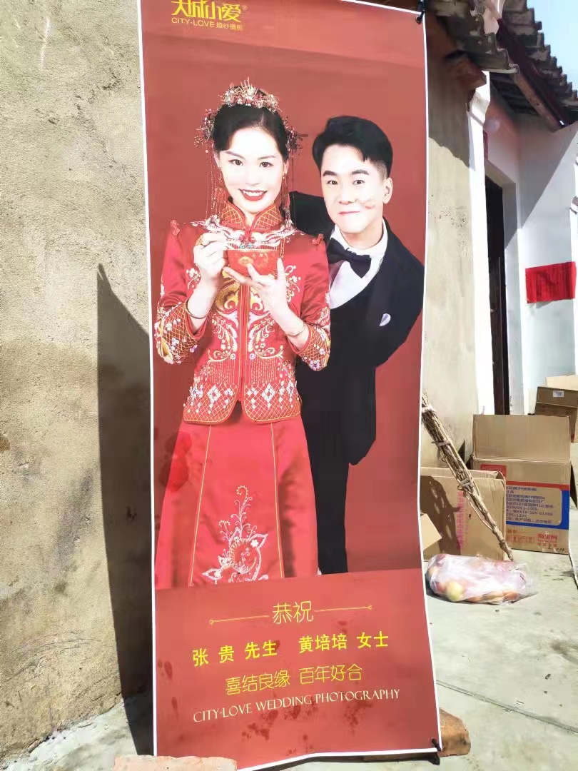黄培培说:“我俩都没法回去,我爸妈担心参加婚礼的宾客不知道新郎新娘是谁,还特意在门口立了海报。这个特殊的婚礼,我一辈子都会记得清楚。”
