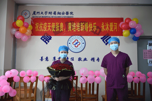 10月15日,厦门大学附属翔安医院的同事们为新娘黄培培和新郎张贵献上了一份特殊的婚礼祝福。原来,早在国庆,黄培培和张贵的婚礼就在黄培培的河南老家举行,现场宾客云集,翘首盼望新郎新娘出场,而在热烈的掌声下登场的却是女方的父母。黄培培和张贵双双缺席了自己的婚礼,此时的他们正携手奋战在厦门疫情的战场——厦门大学附属翔安医院康复病区。