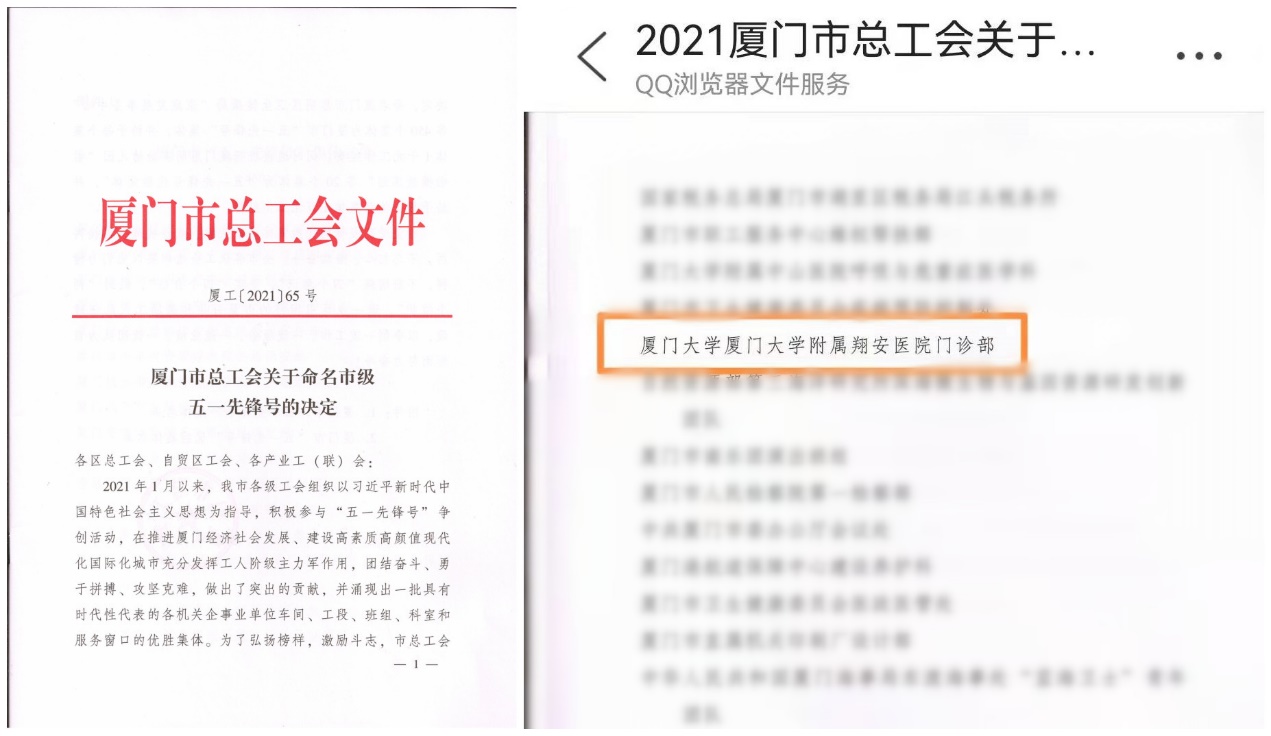日前,厦门市总工会公布2021年厦门市五一先锋号名单,我院门诊部获评厦门市“五一先锋号”集体。