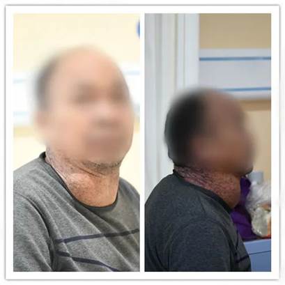 59岁的老郭是翔安区马巷镇人,未婚,家庭经济困难,是当地的低保户。他有40余年的精神病史,一直服药治疗。30多年前,老郭就已发现颈前部的肿物,起初没太在意,加上家庭困难等原因疏于治疗,肿物逐渐增大。近年来,肿物已经压迫到气管,每次只要老郭稍微活动,就会出现憋喘,夜间更是不能平躺,入睡困难。老郭先后到厦门多家医院就医,但是因为手术难度大,风险高,再加上他患有精神病,几家医院均不愿意接诊治疗。