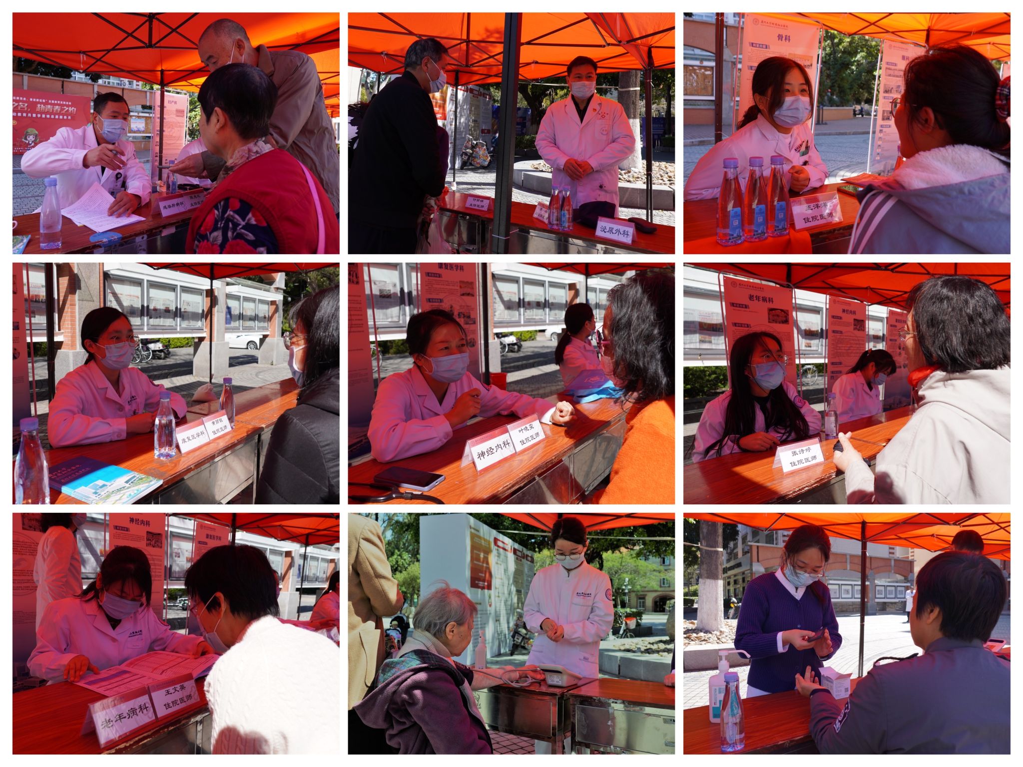 义诊现场,各科专家根据各自的专业特长,耐心接待每一位师生百姓,详细询问病情、查看检查报告,对疑问细心解答, 并给予诊治建议。护理人员热情地为师生百姓测量血压、测量血糖。