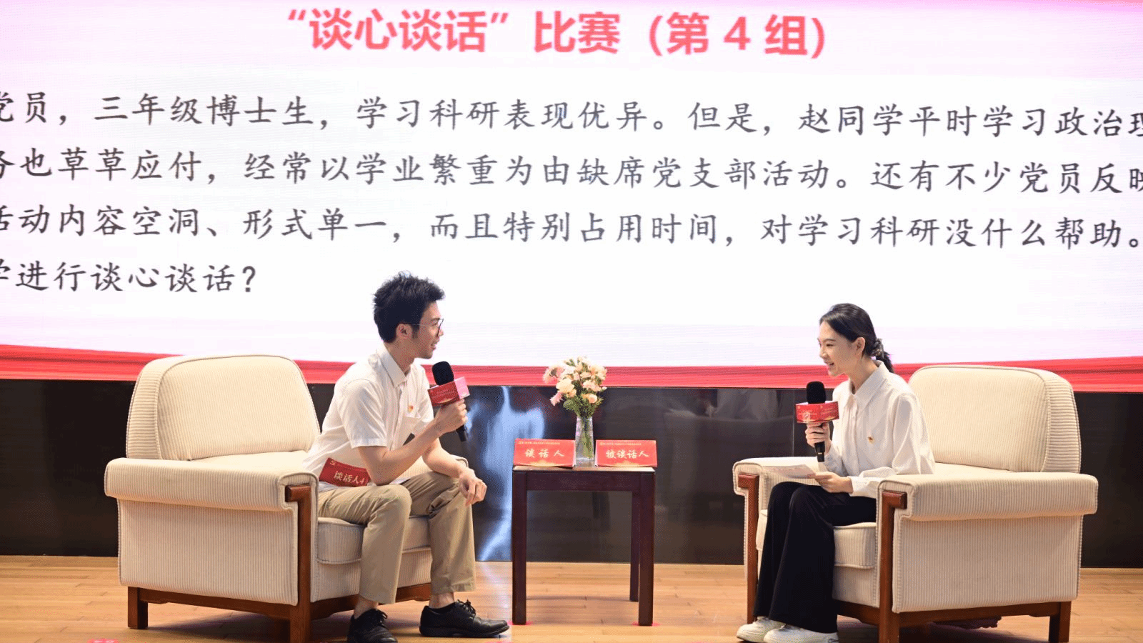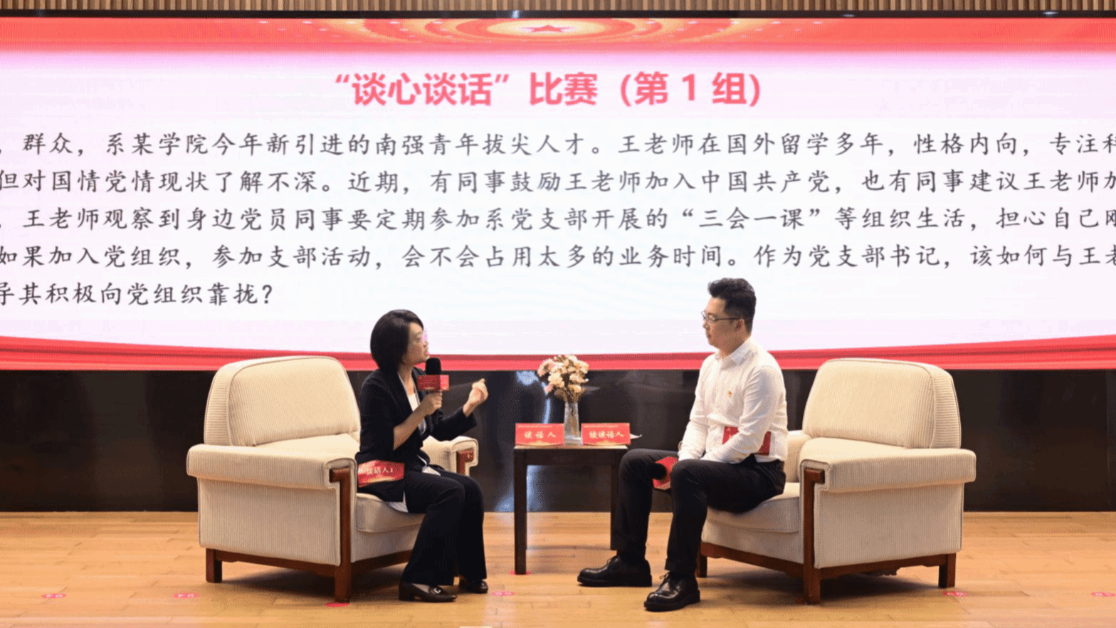 在第三阶段“谈心谈话”情景模拟比赛中,黄浩同志和陈建泽同志作为谈话人和被谈话人面对各类工作难题,能够准确把握原则、有效沟通引导,展现了在日常工作中处理复杂问题的实战能力。