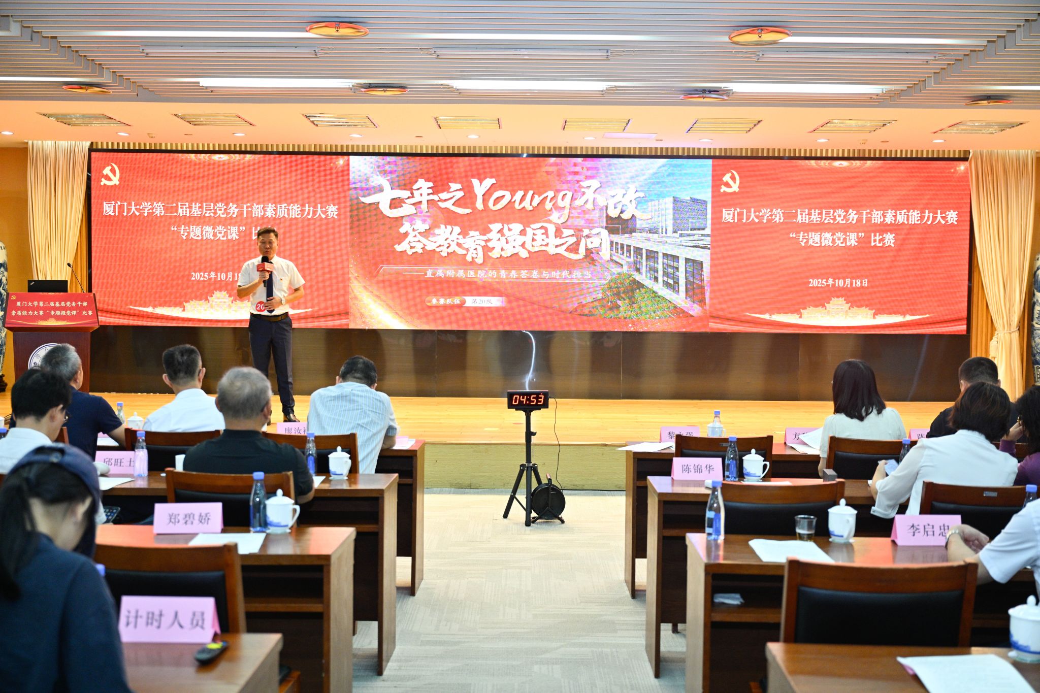 在第二阶段的“专题微党课”比赛中,张佳坡同志代表作了题为《七年之YOUNG不改 答教育强国之问——直属附属医院的青春答卷与时代担当》的精彩宣讲。他紧扣“教育强国”主题,生动讲述了医院党委自成立来,在创业攻坚、立德树人、服务社会方面的奋斗历程与鲜活实践,深情诠释了大学直属附属医院所肩负的育人初心与时代使命。