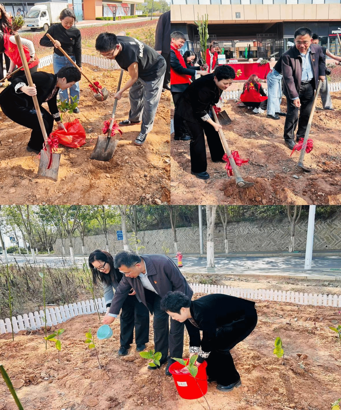 15时30分,植树环节正式开始。参与人员分为两组,分工协作,挥锹挖坑、扶苗培土、提水浇灌,各环节衔接有序、配合默契。经过共同努力,现场共栽植常绿乔木与花灌木6至8棵,为园区增添了一片盎然生机。每棵树苗均悬挂专属树牌,寄托参与人员的美好寄语,也象征着双方合作情谊的深植厚培。