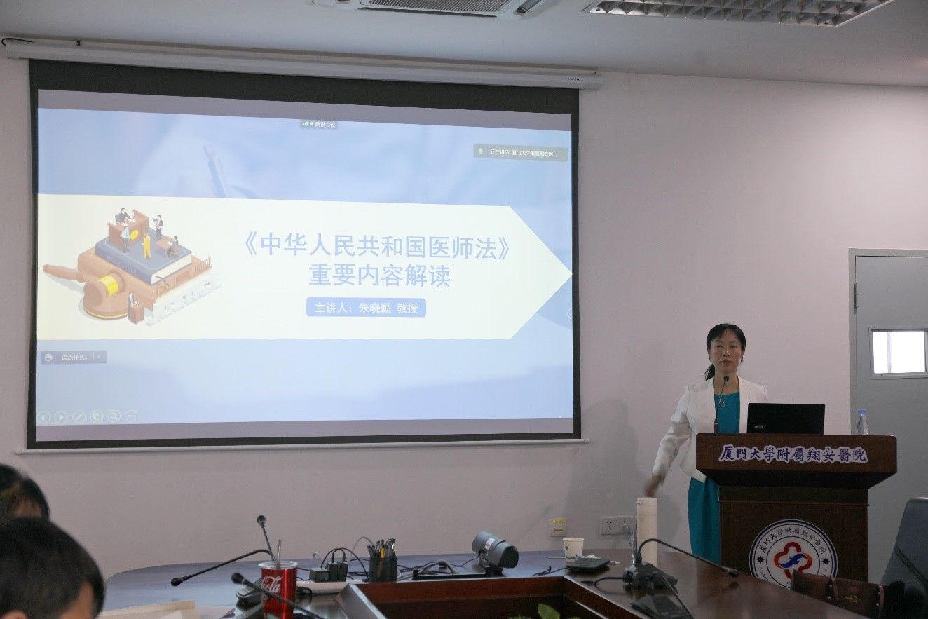 3月31日,院党委理论学习中心组开展了2022年度第3次扩大学习会。会议邀请厦门大学法学院副院长朱晓勤教授对《中华人民共和国医师法》(以下简称《医师法》)进行宣讲解读。医院党政领导班子全体成员,中层干部、支部书记及全院职工通过线上线下相结合的方式参加学习。