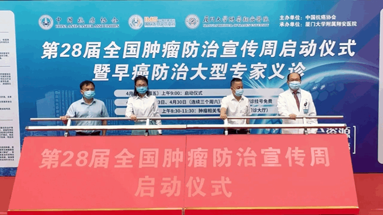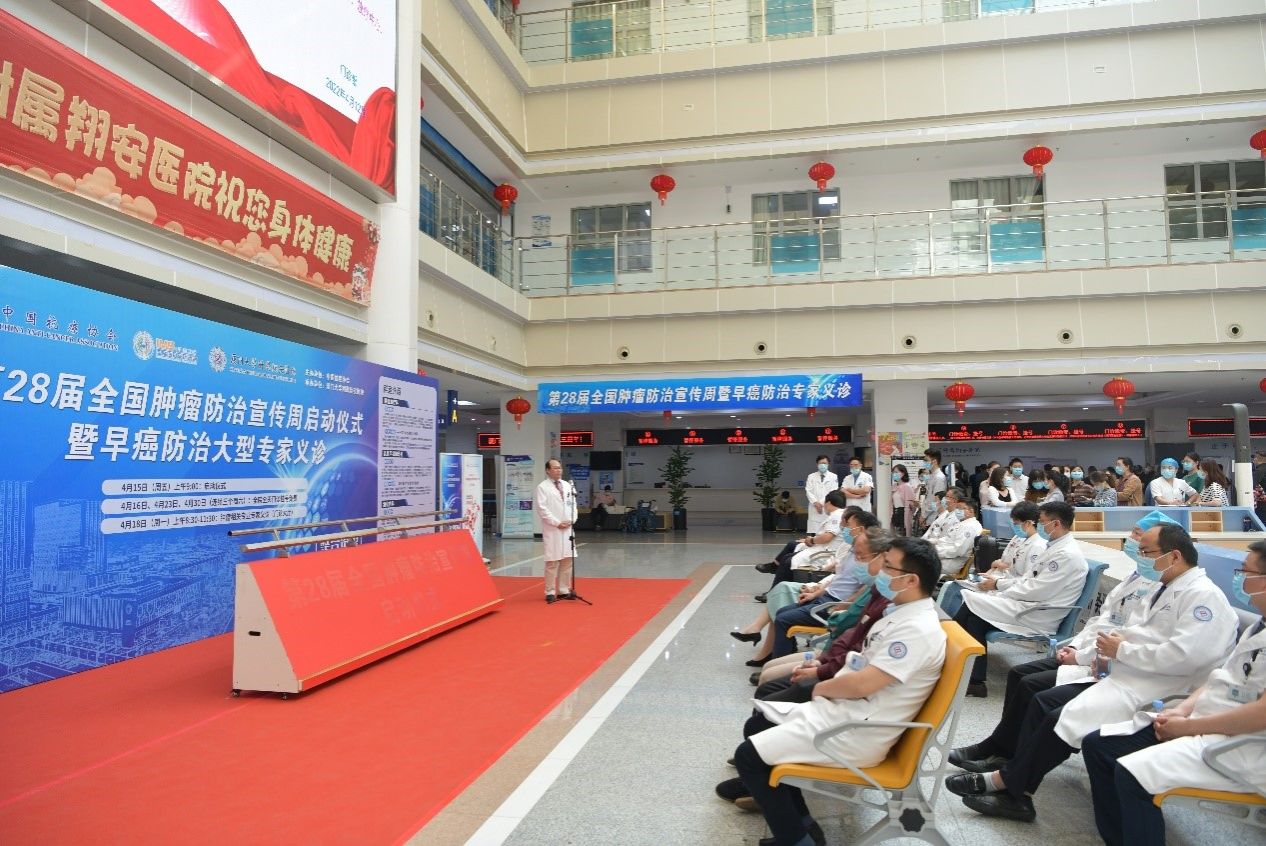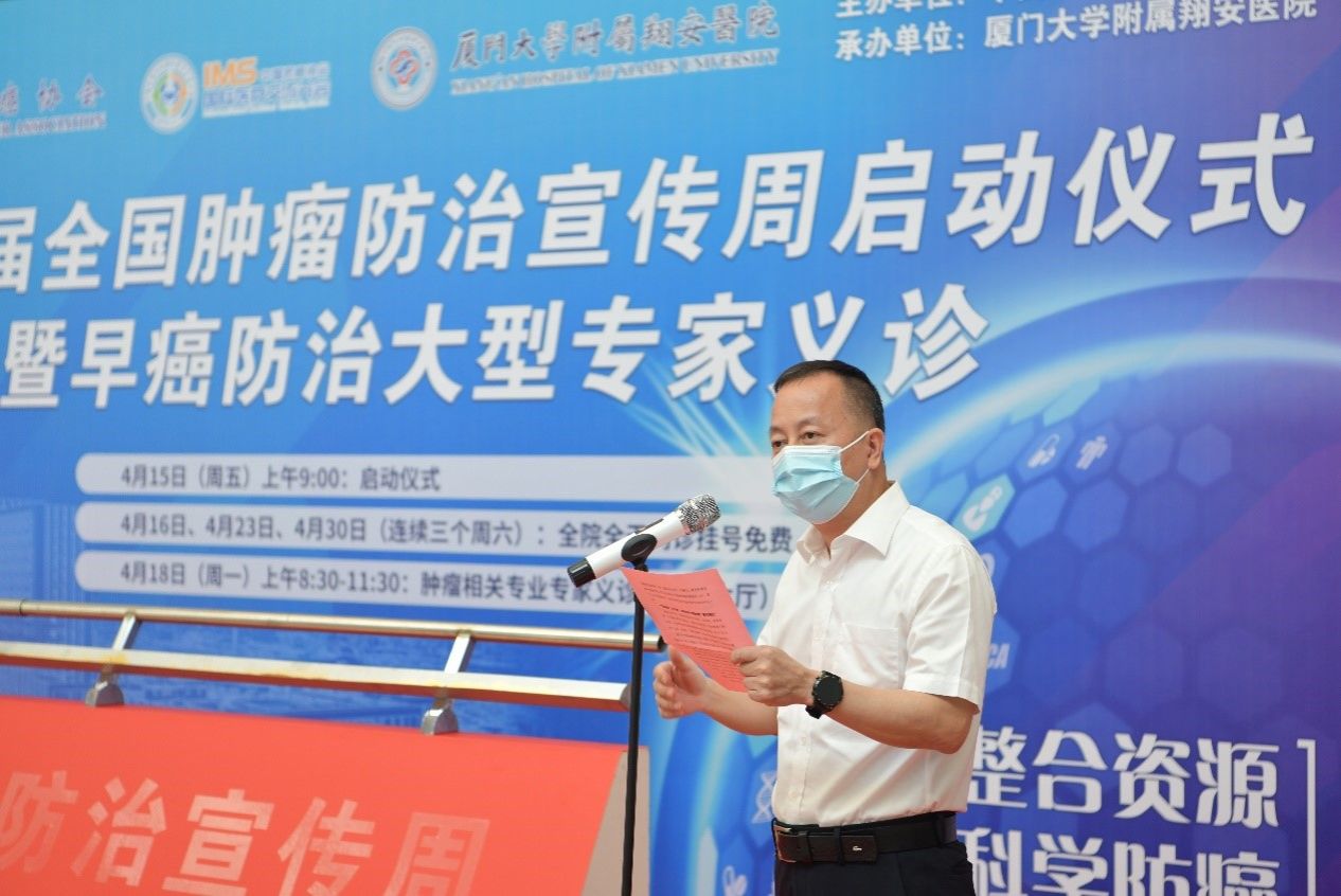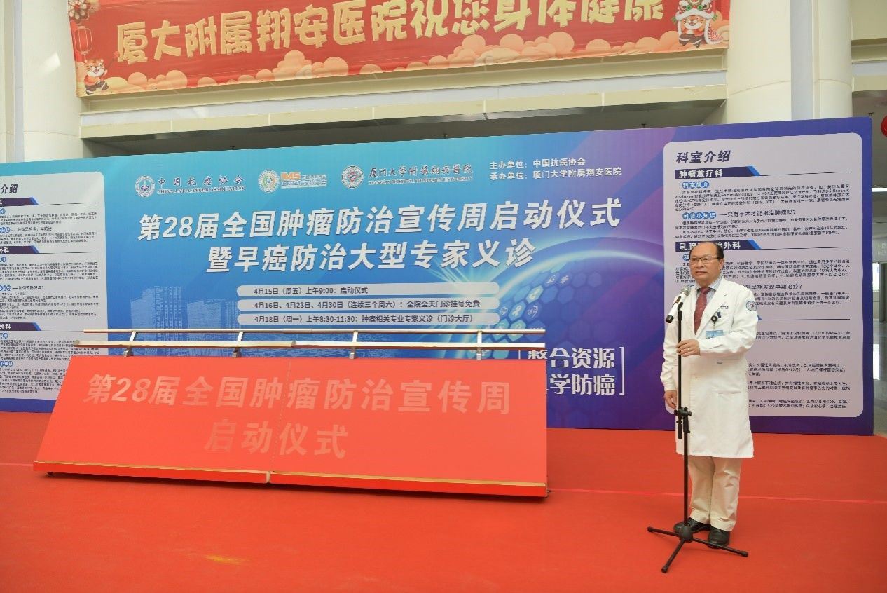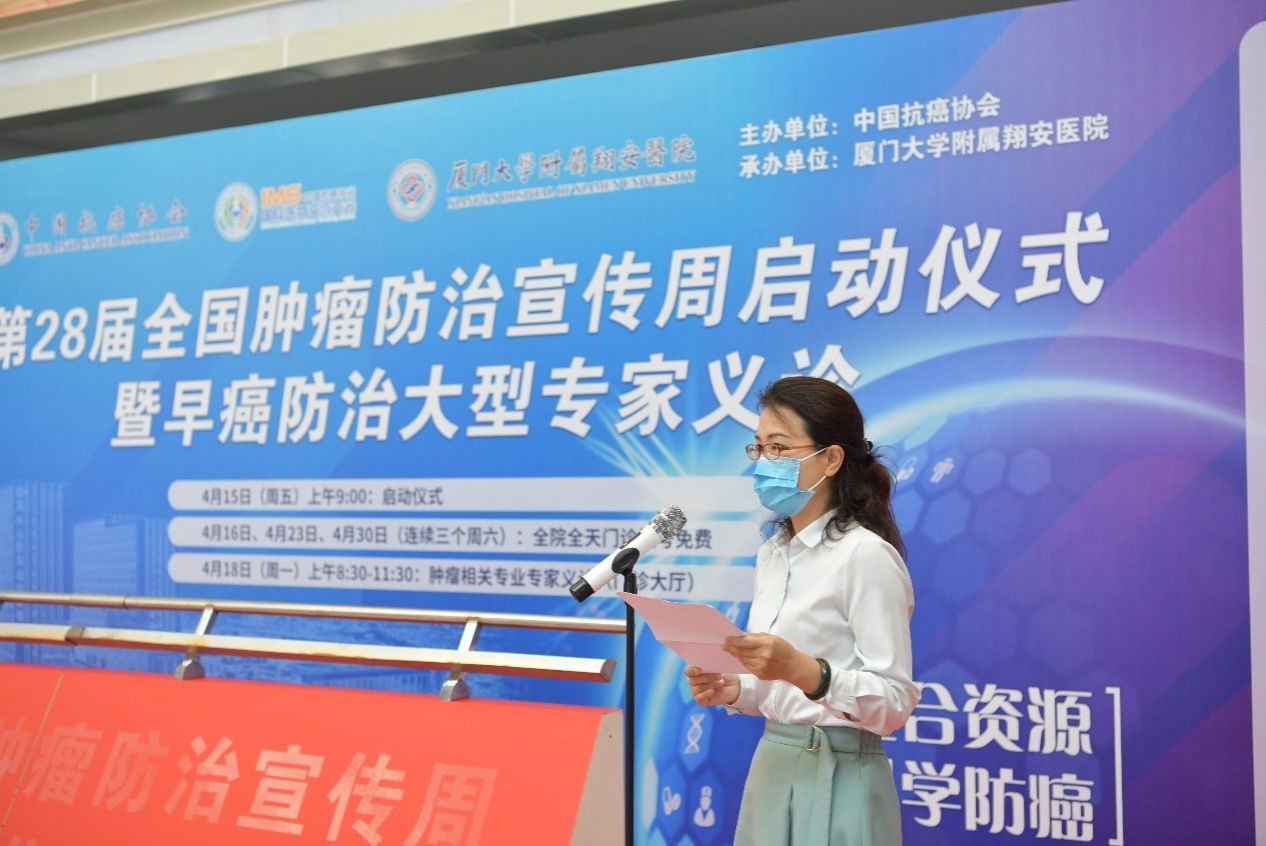 4月15日上午9点,厦门大学附属翔安医院在门诊楼一楼大厅举行“第28届全国肿瘤防治宣传周”启动仪式,厦门市卫健委医政医管处副处长陈兰,翔安区副区长洪求瑛出席并致辞,参加启动仪式的还有医院领导班子成员,各科室、部门负责人及代表,仪式由副院长邵晨主持。