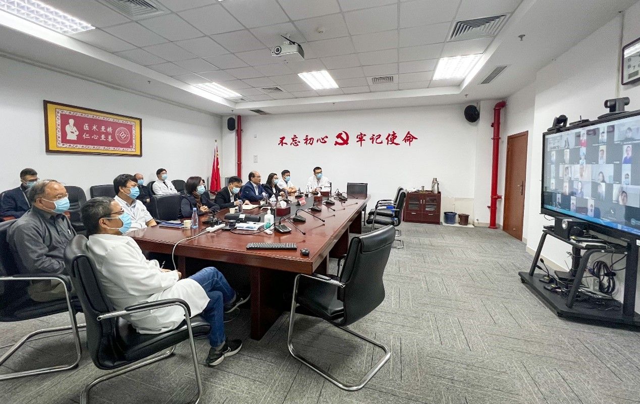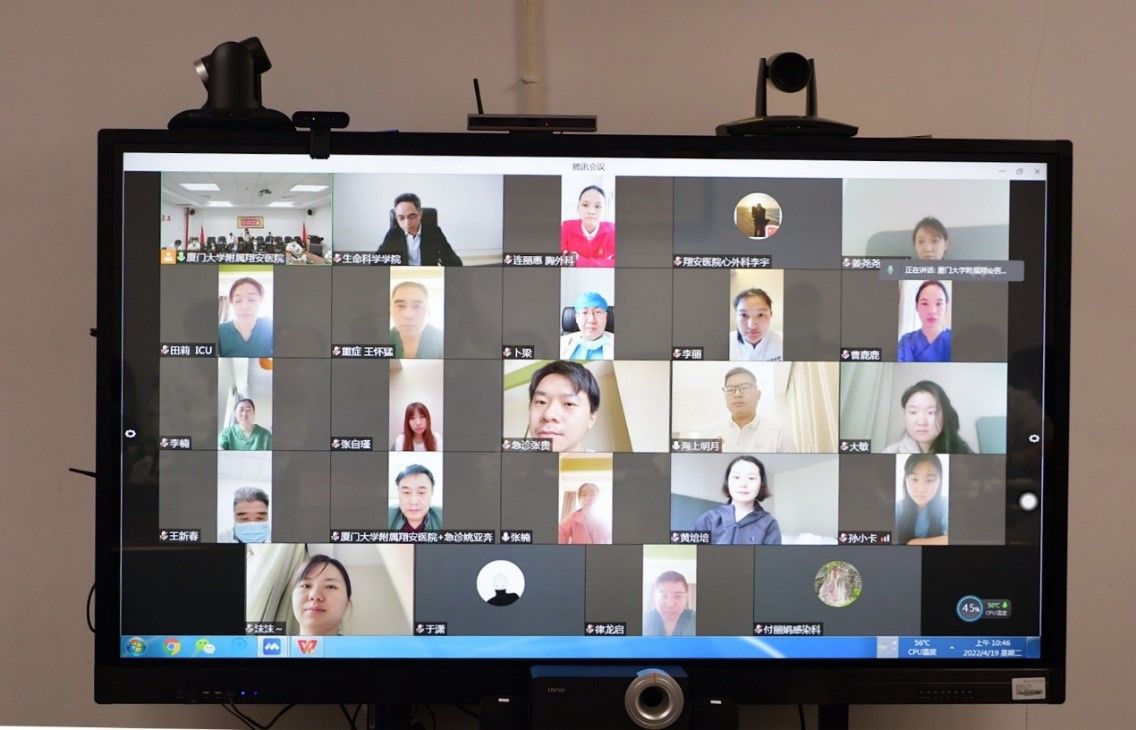 4月19日上午,厦门大学副校长周大旺、附属翔安医院班子成员通过视频连线的方式,关心慰问奋战在上海疫情前线的医疗队员。医疗队队长李宇、张楠在视频连线中介绍了医疗队的工作情况。会议由院党委书记张建安主持。