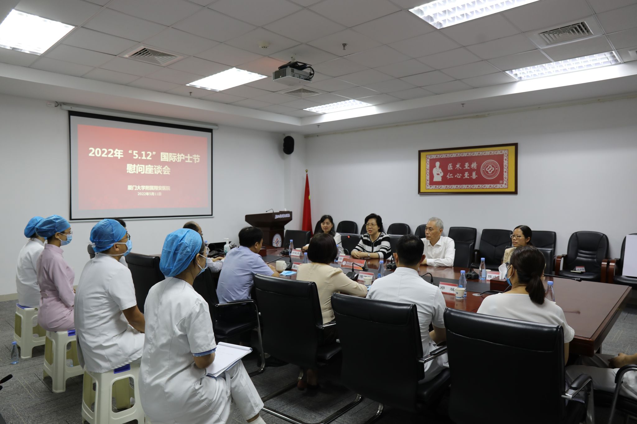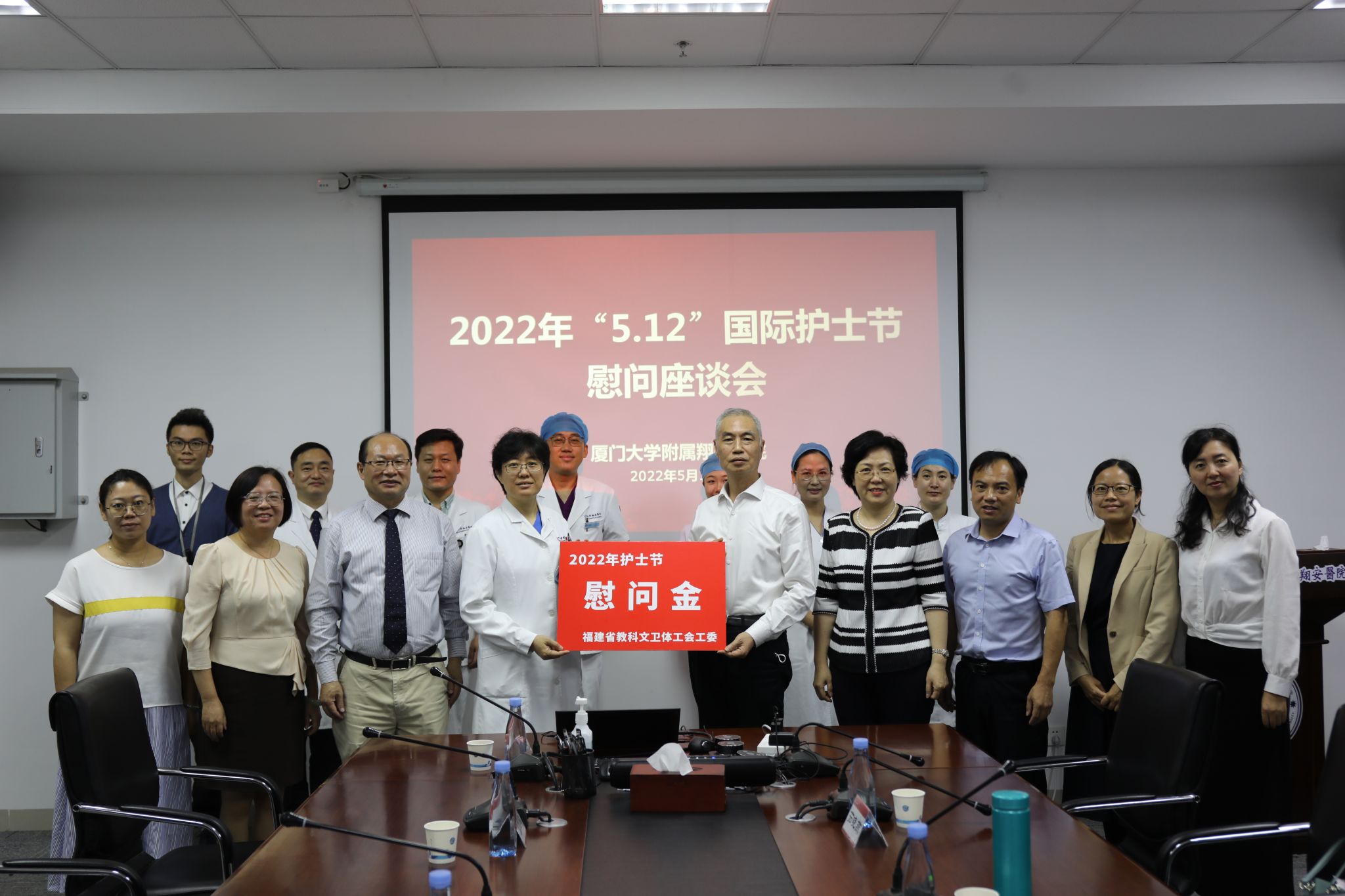 5月11日上午,在第111个国际护士节来临之际,厦门大学党委常委、副校长、校工会主席邓朝晖,厦门大学工会常务副主席叶鹏飞,校工会副主席、校妇委会主任陈小芬,校工会副主席茹晓燕一行来到附属翔安医院,关心慰问护理人员,送上省教科文卫体工委工会、校工会的关怀。院党委书记张建安、执行院长张国君、党委副书记傅万里、工会主席付丽娟、护理部及护士代表参加座谈会。会议由医院党委副书记傅万里主持。