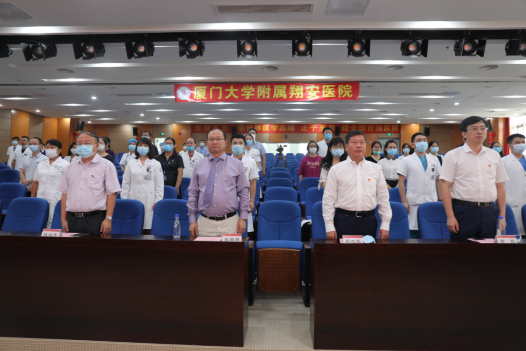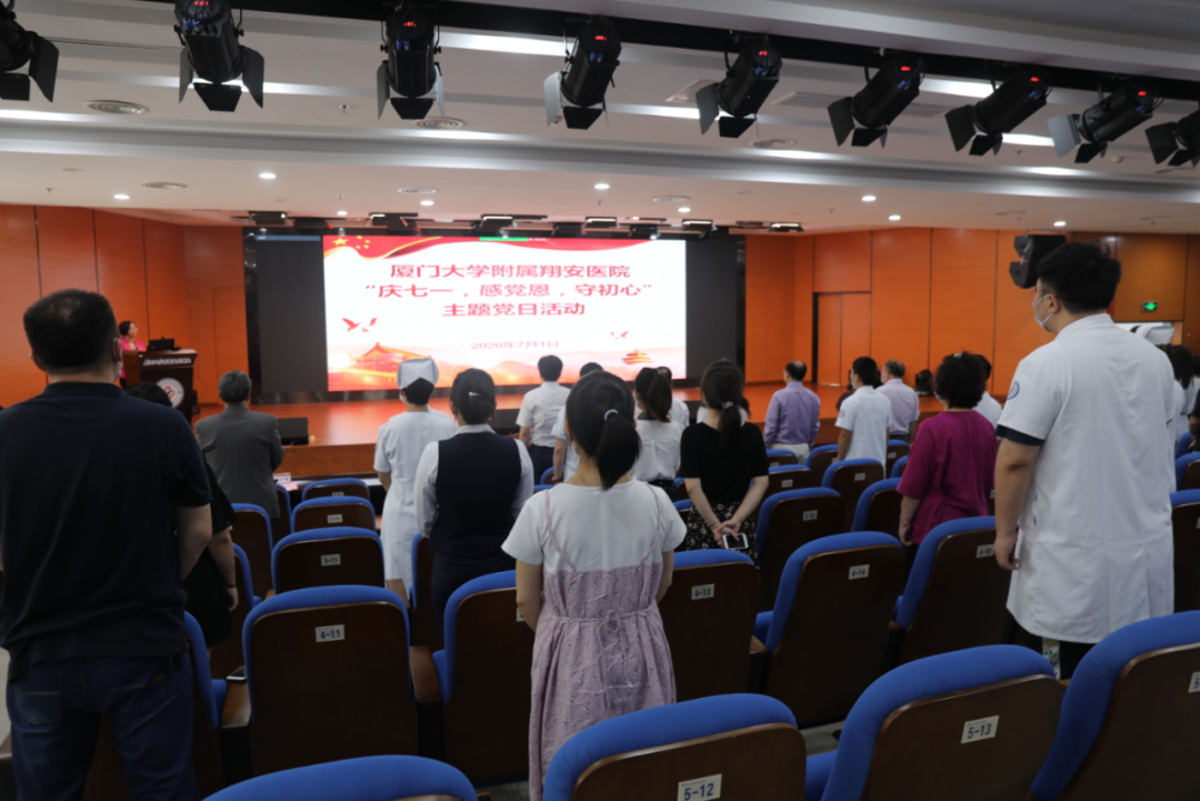 为庆祝中国共产党成立99周年,歌颂党的丰功伟绩,7月1日,厦门大学附属翔安医院开展了“庆七一,感党恩,守初心”主题党日活动,通过“观看一个短视频、分享一次政治生日感言,聆听一个火线入党故事,重温一次入党誓词,上一堂微党课”,淬炼党员党性,共庆党的生日。院党政领导班子、各党支部党员代表现场参加活动,厦大医院及临床科室党员代表等通过线上方式参加。党委副书记、纪委书记傅万里主持会议。