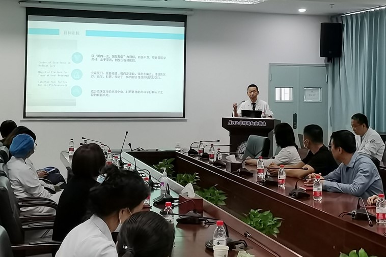 内科第一党支部书记、内分泌科主任王威同志作了关于厦门大学附属翔安医院发展建设的微党课讲座。他详细介绍了我院的建院历程、发展目标、科室设置、人员情况和信息化建设等情况,重点介绍了我院在器官移植、航空救援等方面取得的亮点和成绩。