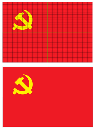 2.画旗面长与宽中线将旗分成4等分的长方形,左上方长方形内划出横18竖12等分的小方格。党徽图案切于8×8小方格的正方形内,正方形的上部与旗上边空3格,左侧与旗左边空4格。