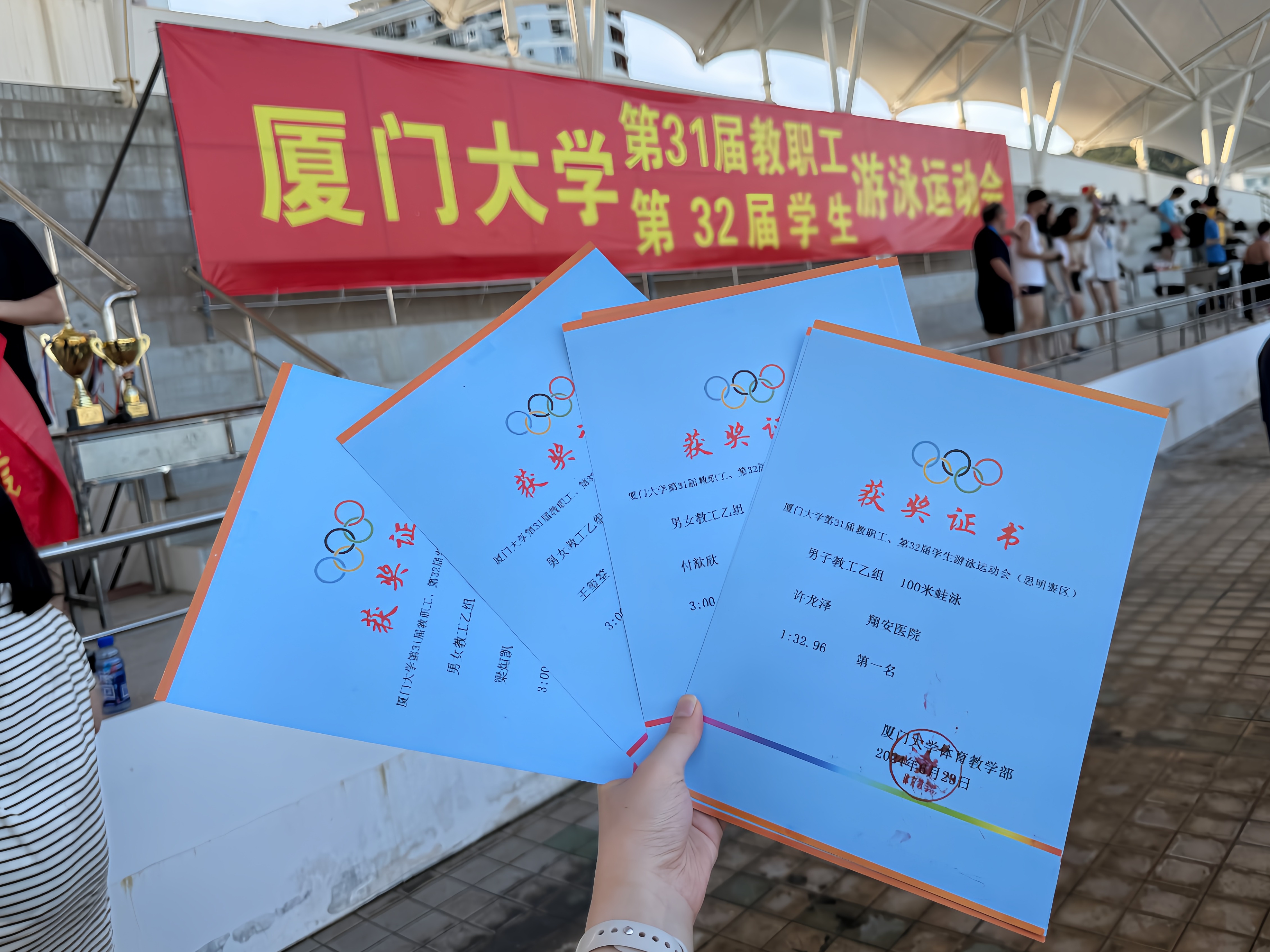 6月23日,厦门大学第31届教职工游泳运动会在思明校区王清明游泳馆火热举行,我院斩获男女教工组4×50米自由泳接力赛第三名和两个个人项目奖项。