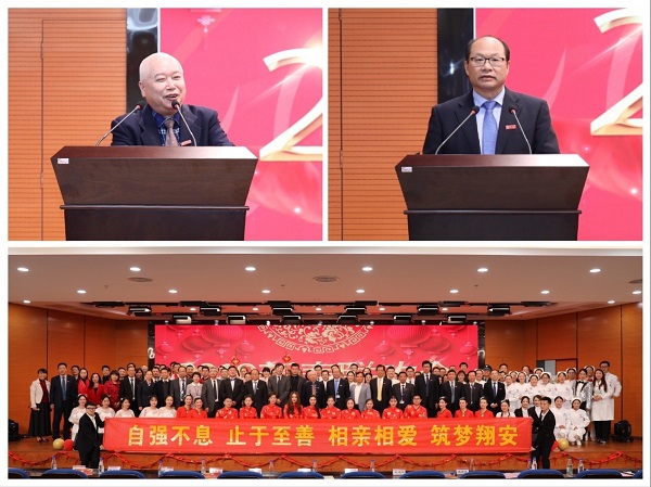 执行院长张国君教授发表了热情洋溢的新春致辞,他代表医院领导班子对各界领导、全院职工及家属表示衷心的感谢和新春的祝福。张院长谈到,2018年描绘了我国改革开放40周年的壮丽诗篇,拉开了翔安医院奋勇开拓的开局之年,全院职工能以饱满的情绪和昂扬的斗志备战开业,推动医院各项筹备工作取得重大进展。2018年12月28日,医院成功实现试运营。2019年,在98周年校庆期间将迎来医院正式开业,他用“小猪佩奇”鼓励大家对待工作要“配齐”责任心、事业心、上进心;对待患者要“配齐”细心、耐心、爱心;对待家人要“配齐”关心、感恩之心。他强调大家要精心筹备、分步实施、逐渐铺开、一炮打响,助推医院建设成为“国内一流、国际知名”的临床医学中心,为人民群众的健康事业、为医学教育与科研事业贡献力量。