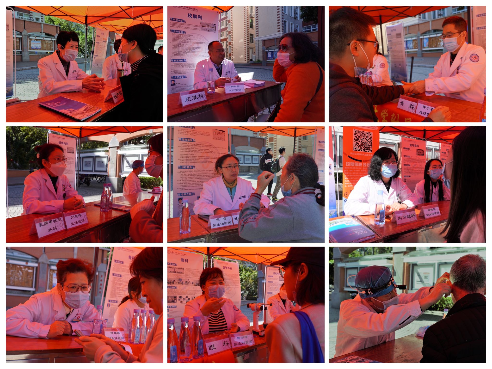 义诊现场,各科专家根据各自的专业特长,耐心接待每一位师生百姓,详细询问病情、查看检查报告,对疑问细心解答, 并给予诊治建议。护理人员热情地为师生百姓测量血压、测量血糖。