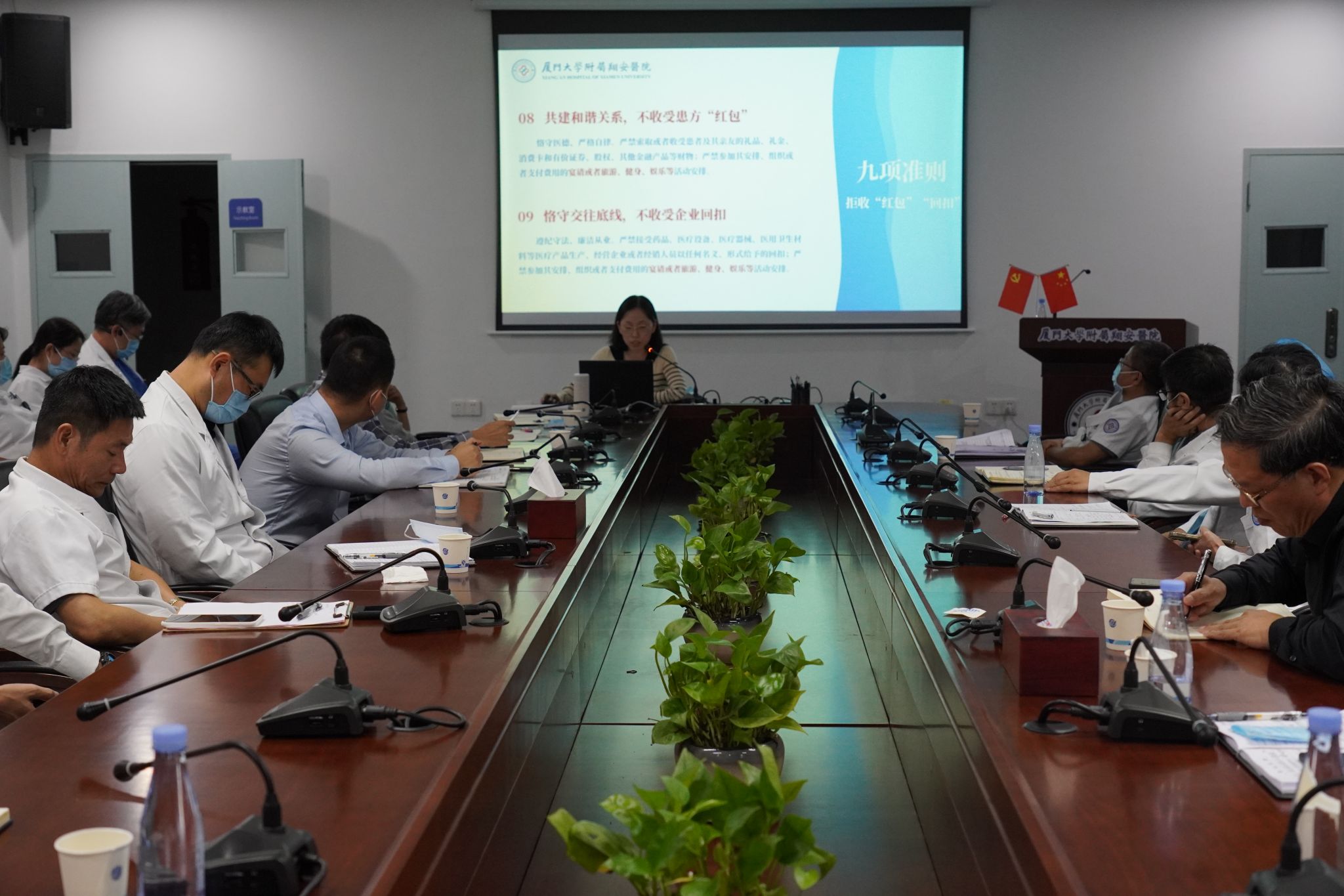 纪检监察室工作人员章哲首先带领大家作专题学习。章哲着重介绍了《九项准则》的第八、九两条内容,解读了厦门市卫健委和厦门大学附属翔安医院关于收受“红包”“回扣”责任追究的相关规定,并且结合真实案例讲解了收受“红包”“回扣”将会受到怎样严重的处理。学习会重点强调了容易被忽视的“饭桌违纪”问题,指出接受管理服务对象组织或者支付费用的宴请是明令禁止的一种收受“回扣”行为,要求医务人员恪守交往底线,严禁参加药品、医疗设备、医疗器械、医用卫生材料等医疗产品生产、经营企业或者经销人员安排、组织或者支付费用的宴请或者旅游、健身、娱乐等活动安排。