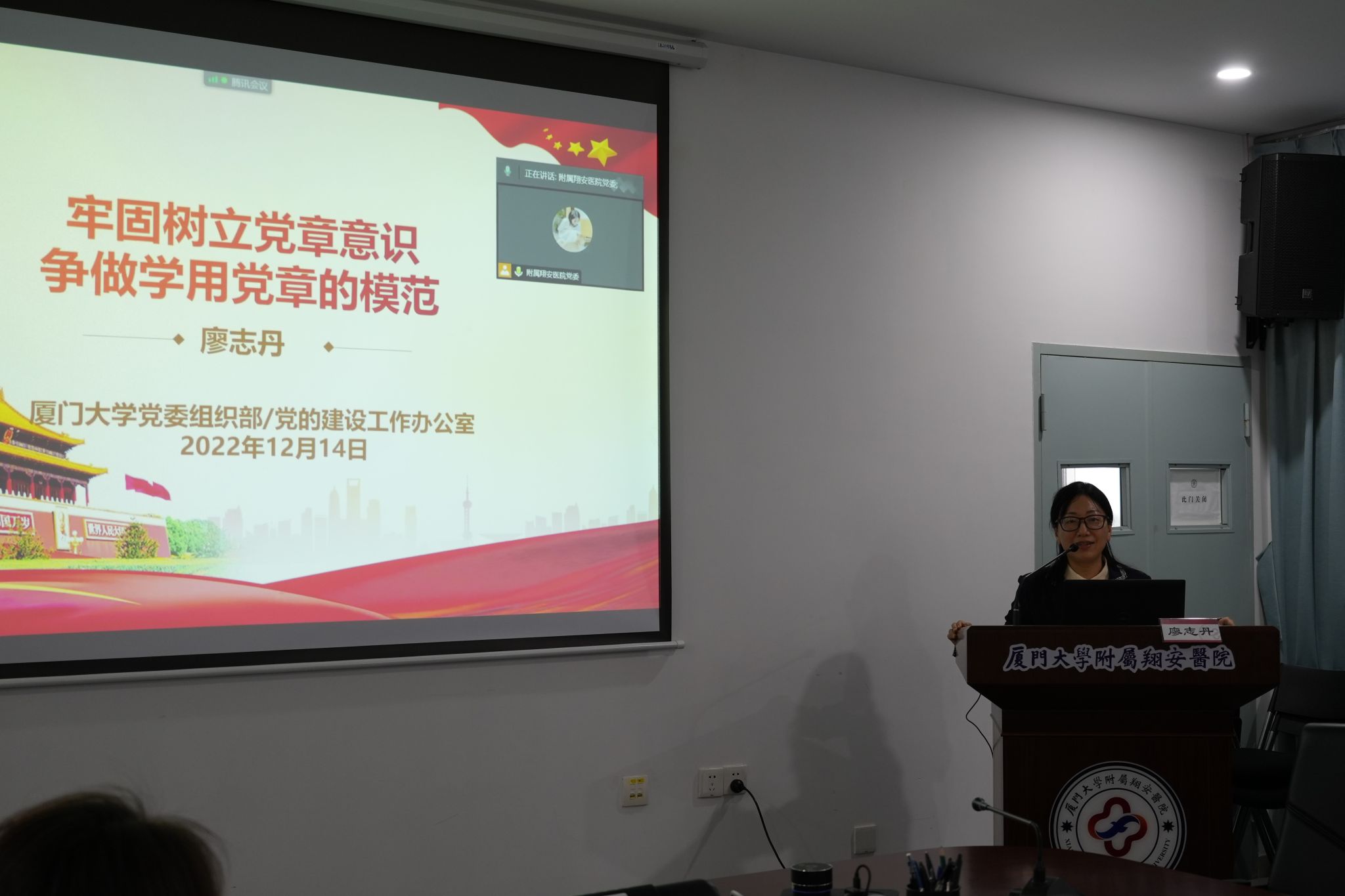 为深入学习宣传贯彻党的二十大精神,进一步学深悟透党的二十大修订的《中国共产党章程》,引导全体党员强化尊崇党章、严守党规、遵守党纪的意识,12月14日,厦门大学附属翔安医院党委举办《牢固树立党章意识,争做学用党章的模范》专题报告会,邀请校党委党的建设工作办公室主任兼组织部副部长、教师工作部副部长、厦门大学学习贯彻党的二十大精神宣讲团成员廖志丹进行授课,院党委书记张建安及全院90余名党员代表参加。