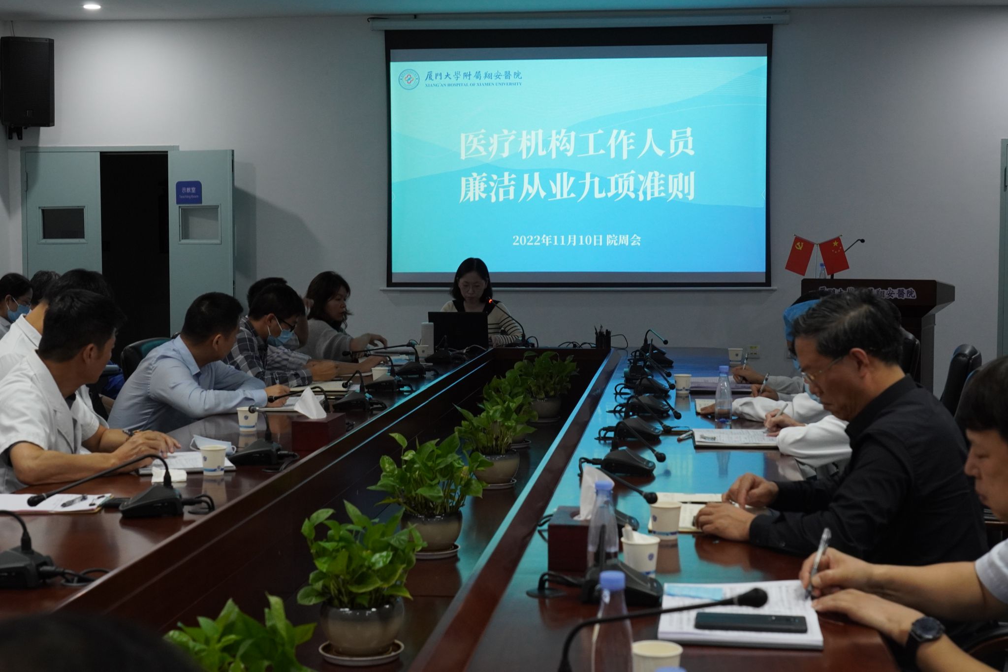 为进一步贯彻落实党的二十大关于党风廉政建设的重要部署,增强医疗卫生人员的责任感和使命感,强化廉洁意识,规范执业行为,11月10日,我院开展拒收“红包”“回扣”警示教育,对《医疗机构工作人员廉洁从业九项准则》进行再学习、再提醒、再教育。学习会由院党委副书记、纪委书记傅万里主持,党政领导班子、各科室部门负责人、护士长、各支部书记参加。