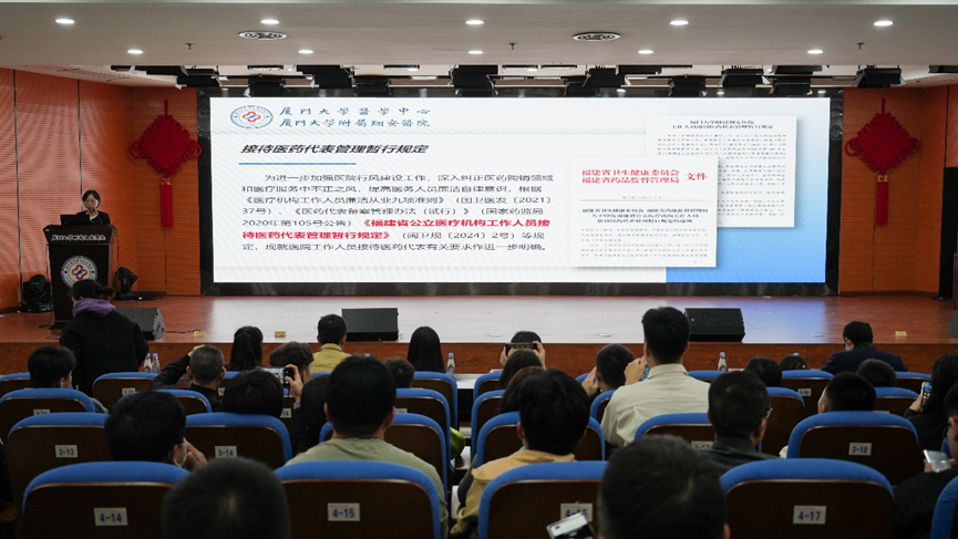 会上,监察审计室副主任章哲解读了《厦门大学附属翔安医院工作人员接待医药代表管理暂行规定》,对医药代表来院开展学术推广活动的要求和流程进行了说明。陈岩表示,药学部党支部将紧抓党风廉政建设,时刻守好药事工作廉洁底线,维护风清气正的医药购销环境。