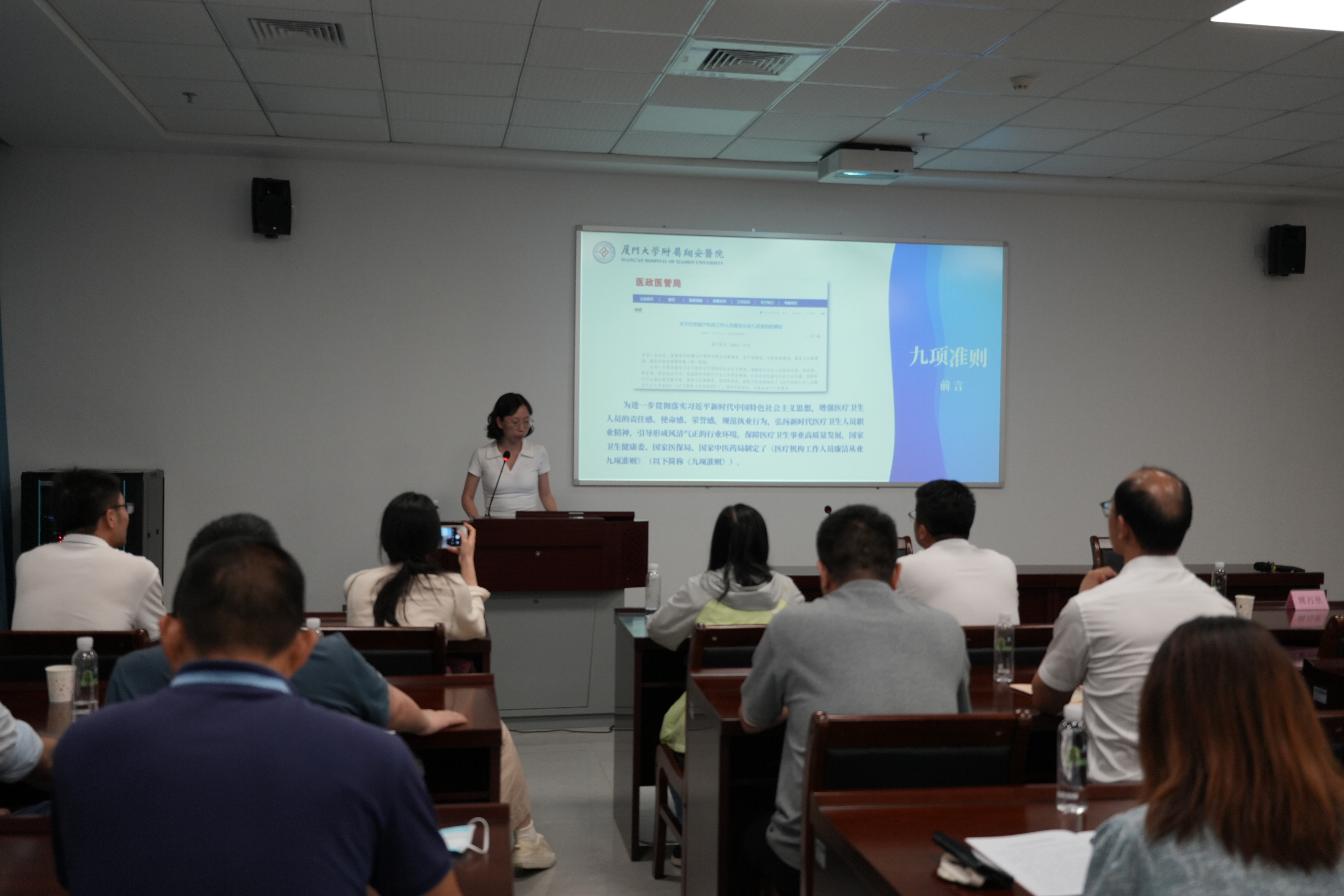 在中共三明市委党校,党员们开展廉政教育专题学习,福建省委党校法学教研部副教授陈巧燕作专题授课,讲解《守纪律 讲规矩——学习贯彻〈中国共产党纪律处分条例〉和〈中华人民共和国公职人员政务处分法〉》,以丰富的违纪违法案例警示教育党员干部以案为鉴、以案为戒。总会计师黄明主讲《人民至上、敢为人先——三明医改启示录》,通过讲述三明医改的前世今生分析我院推进医改工作可汲取的经验。纪检监察室工作人员章哲带领党员们学习了《医疗机构工作人员廉洁从业九项准则》。